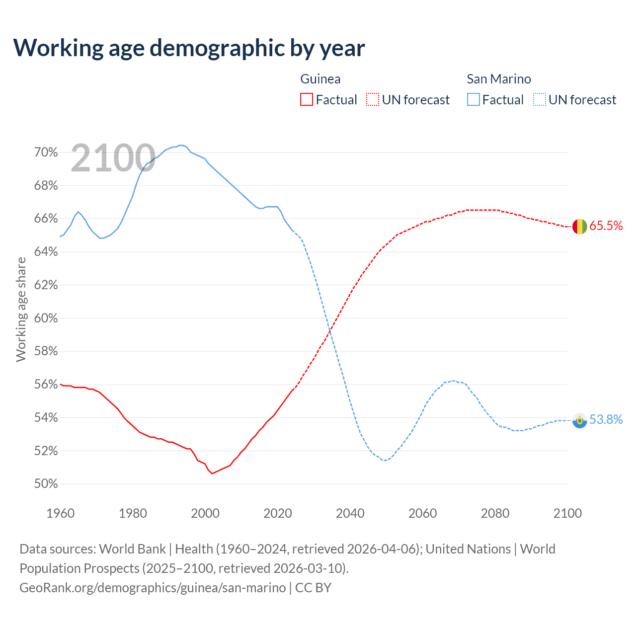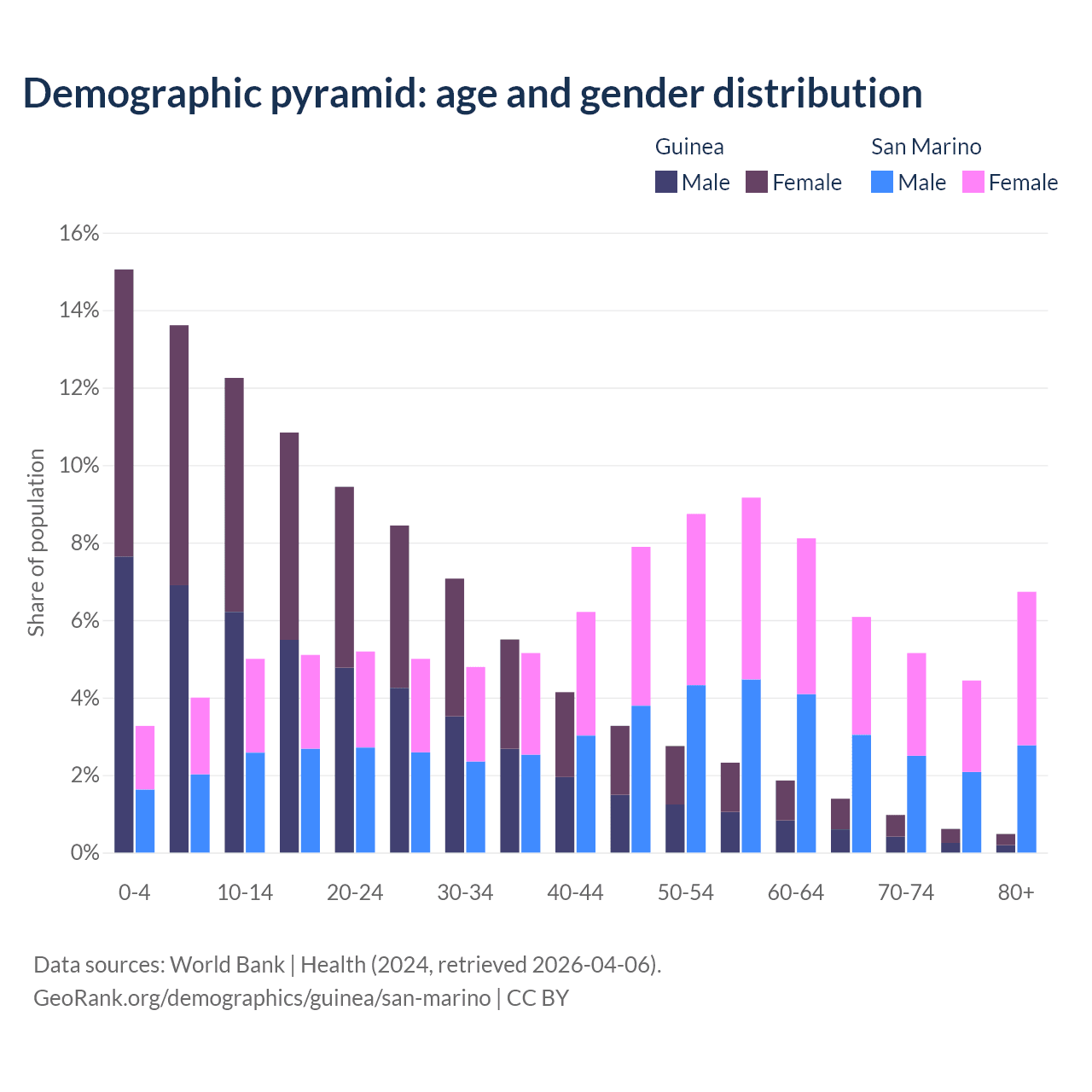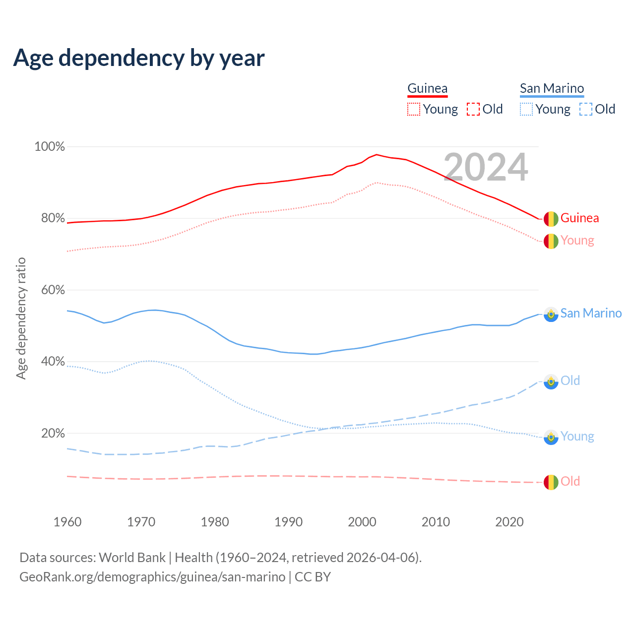 - The share of old-age demographic (65+) in Guinea is 3.46% vs 22.4% in San Marino.