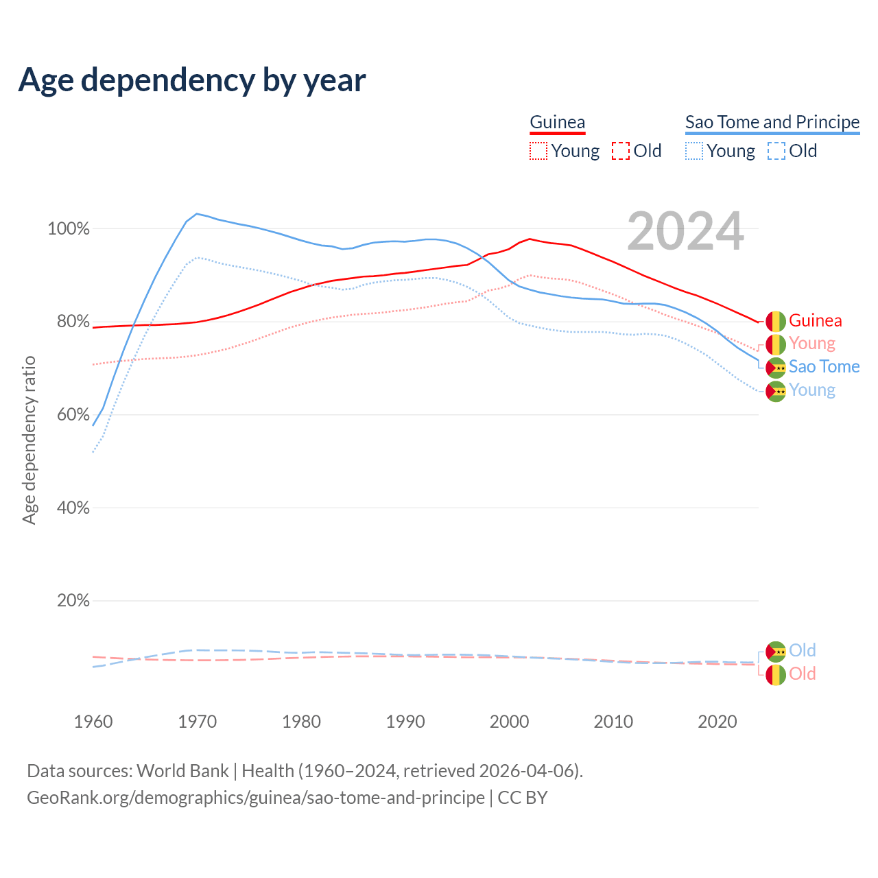 - Guinea is ranked 176/196 by median age (oldest to youngest) vs 163/196 for Sao Tome and Principe.