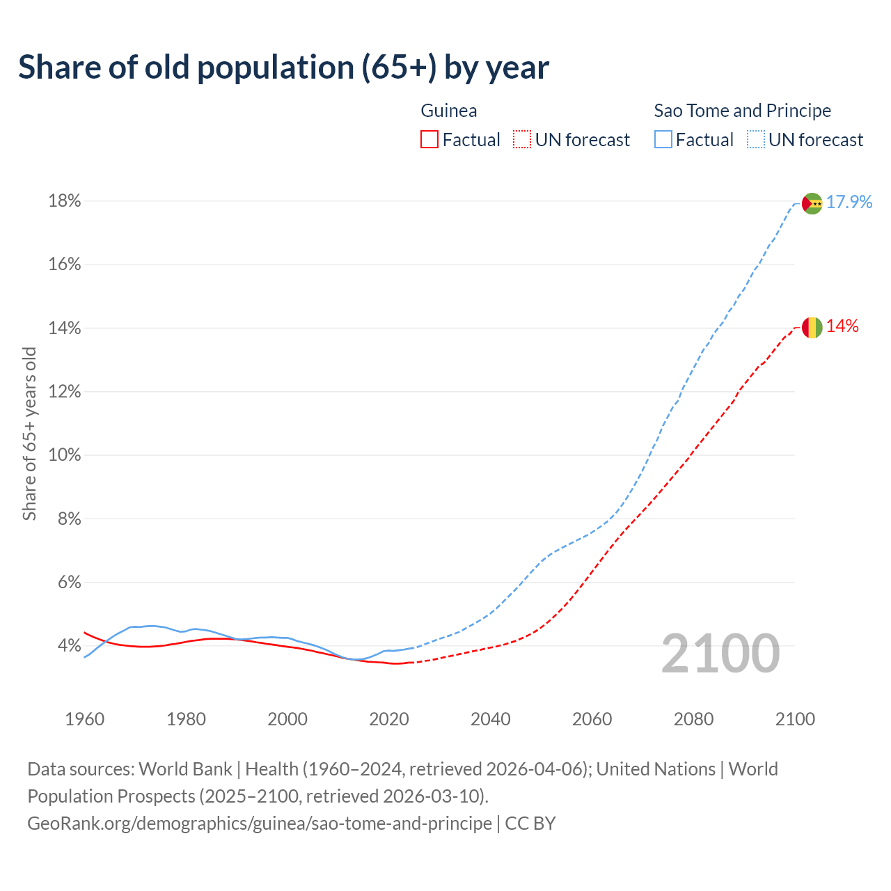 The share of older people aged 65 and over is 3.46% in Guinea and 3.9% in Sao Tome and Principe. Life expectancy in Guinea compared to Sao Tome and Principe .