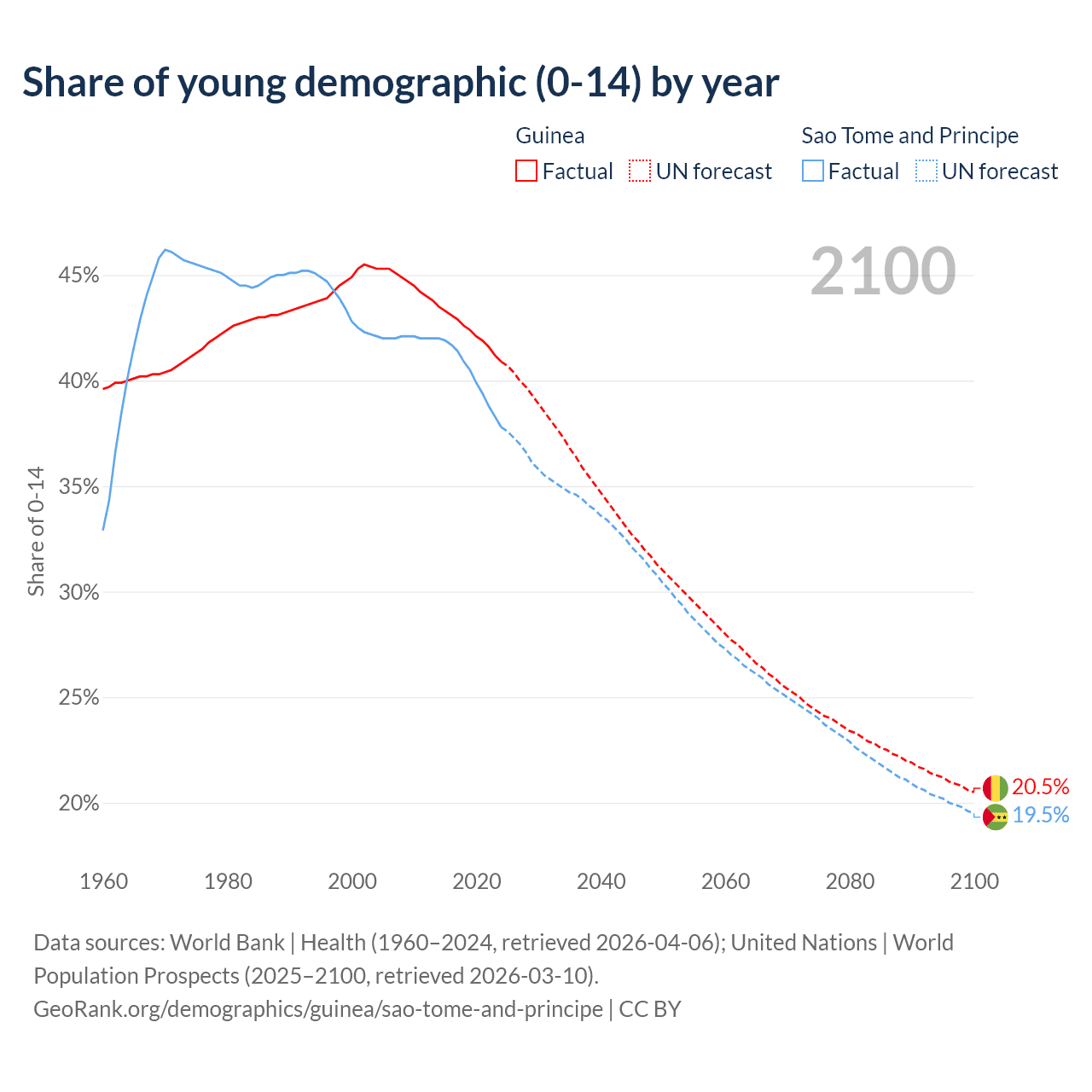 - The share of young demographic (0-15 years old) in Guinea is 40.9% vs 37.8% in Sao Tome and Principe.