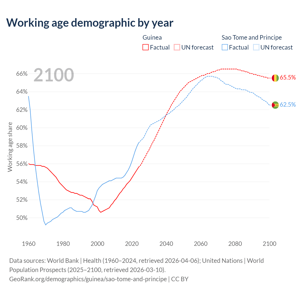- Guinea has 8.65M working age adults (aged 15-64) vs 144K in Sao Tome and Principe.