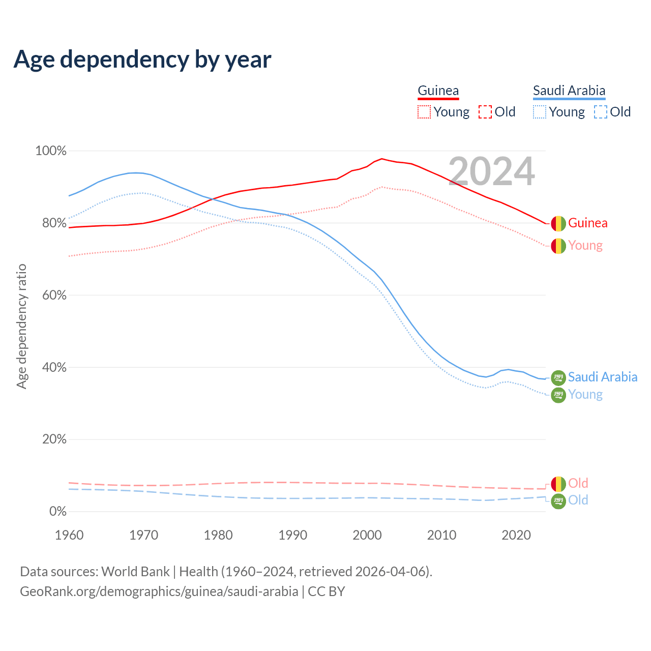 - Guinea is ranked 176/196 by median age (oldest to youngest) vs 98/196 for Saudi Arabia.