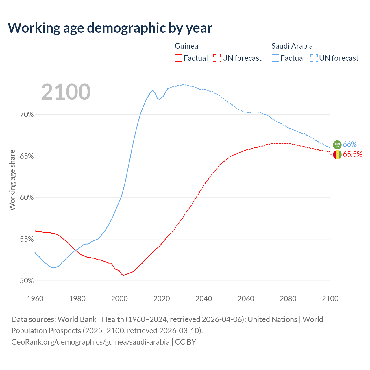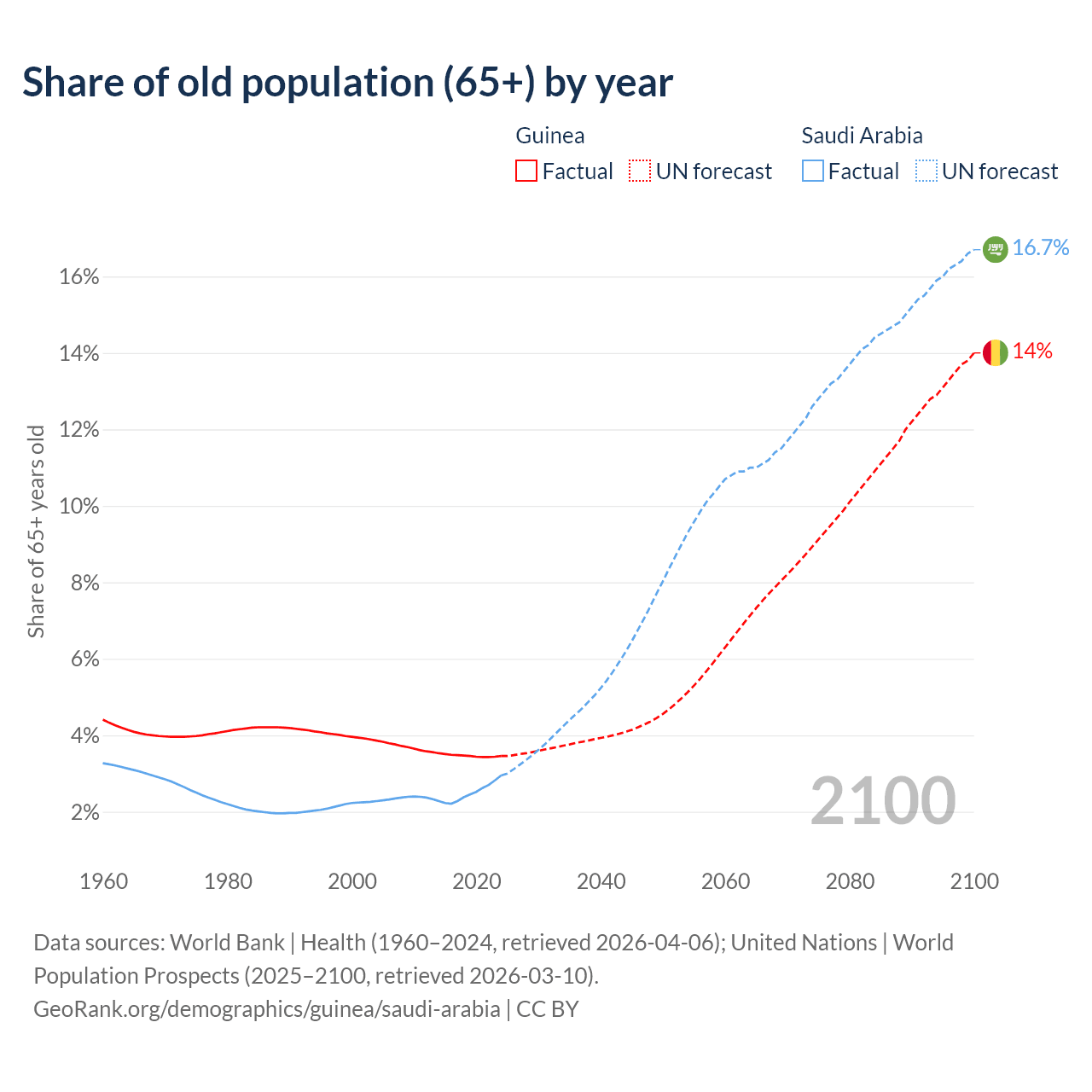 The share of older people aged 65 and over is 3.46% in Guinea and 2.95% in Saudi Arabia. Life expectancy in Guinea compared to Saudi Arabia .