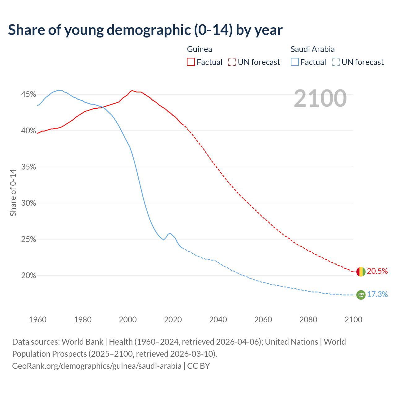 Median age Guinea vs Saudi Arabia, 1960-2100