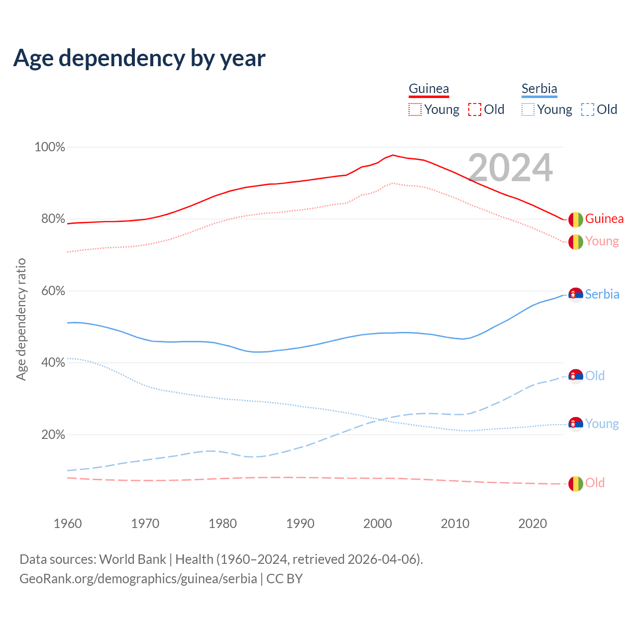 - Guinea is ranked 176/196 by median age (oldest to youngest) vs 15/196 for Serbia.