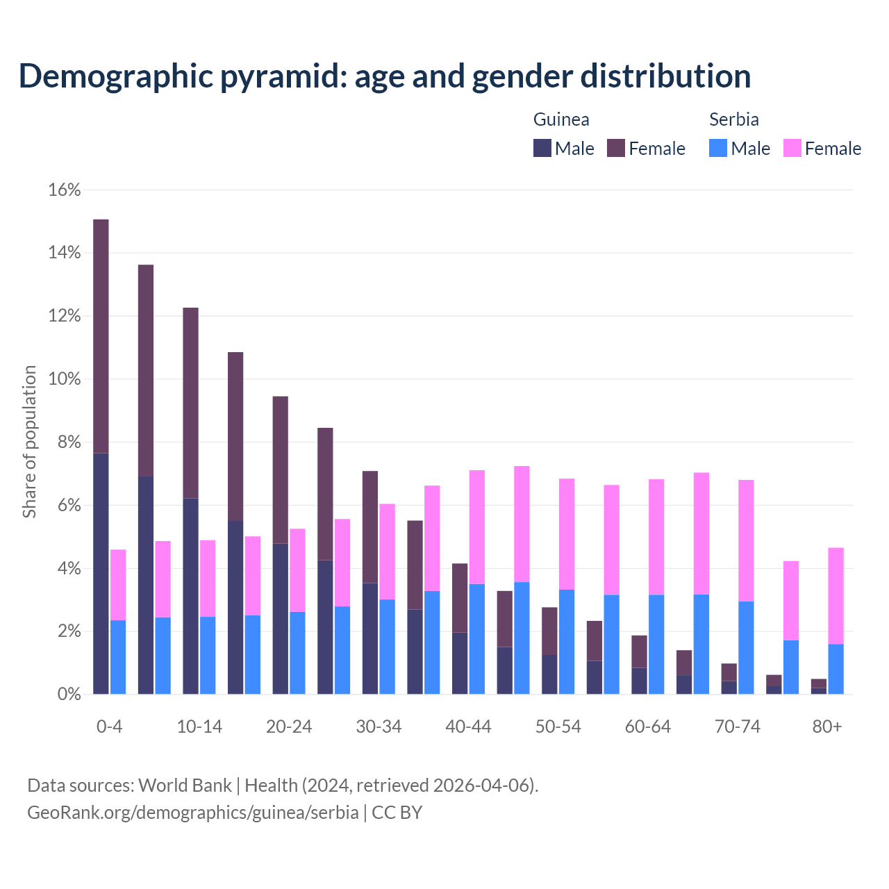 - The share of young demographic (0-15 years old) in Guinea is 40.9% vs 14.3% in Serbia.
