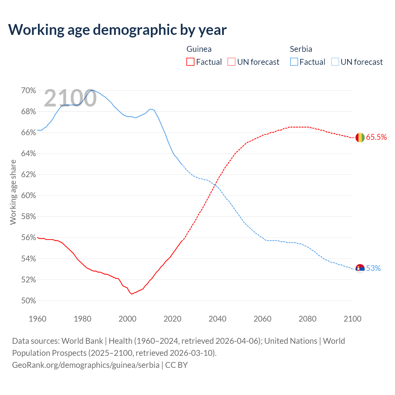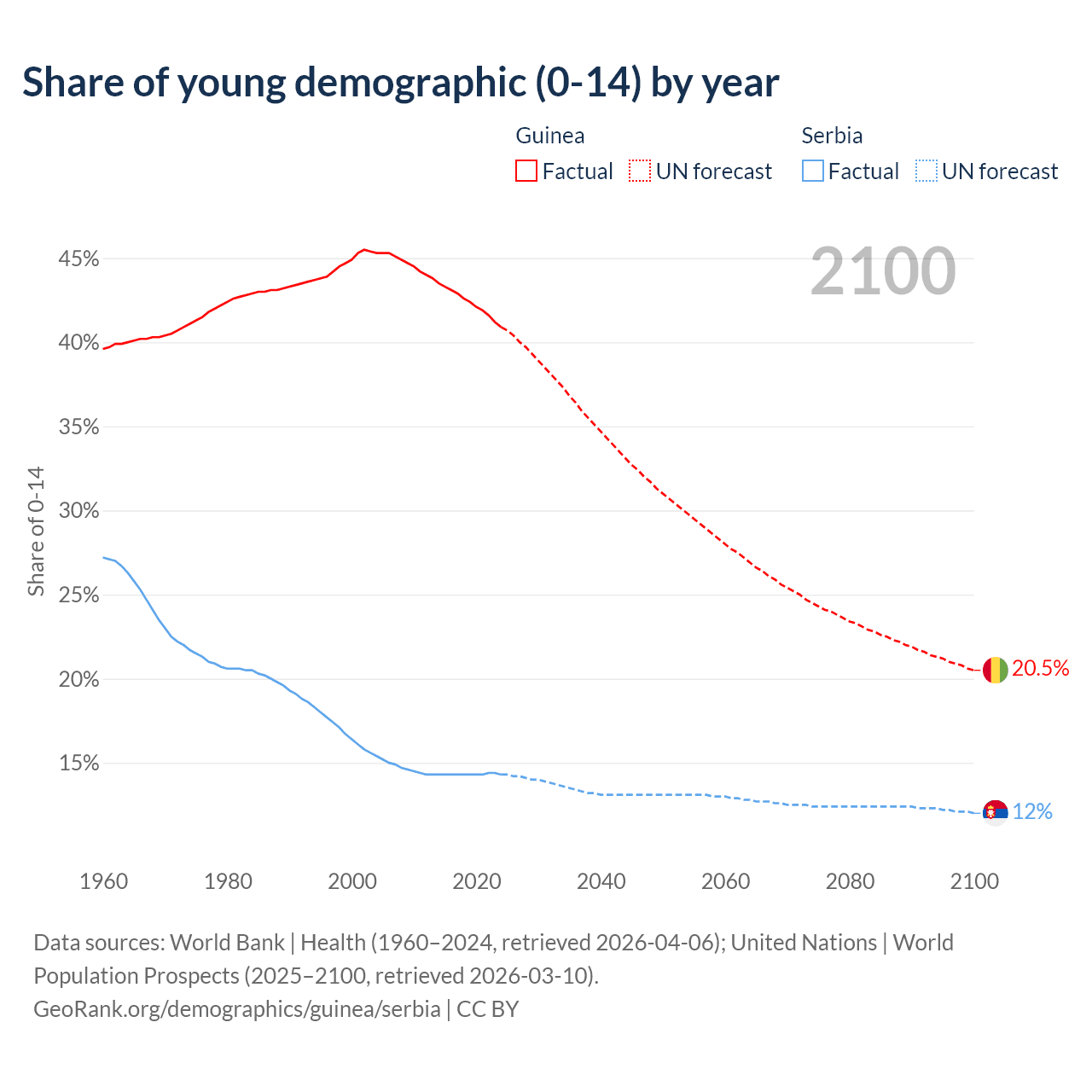 Median age Guinea vs Serbia, 1960-2100