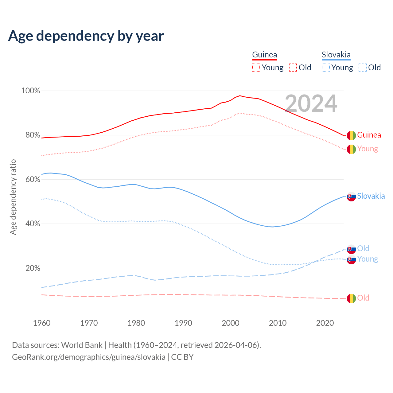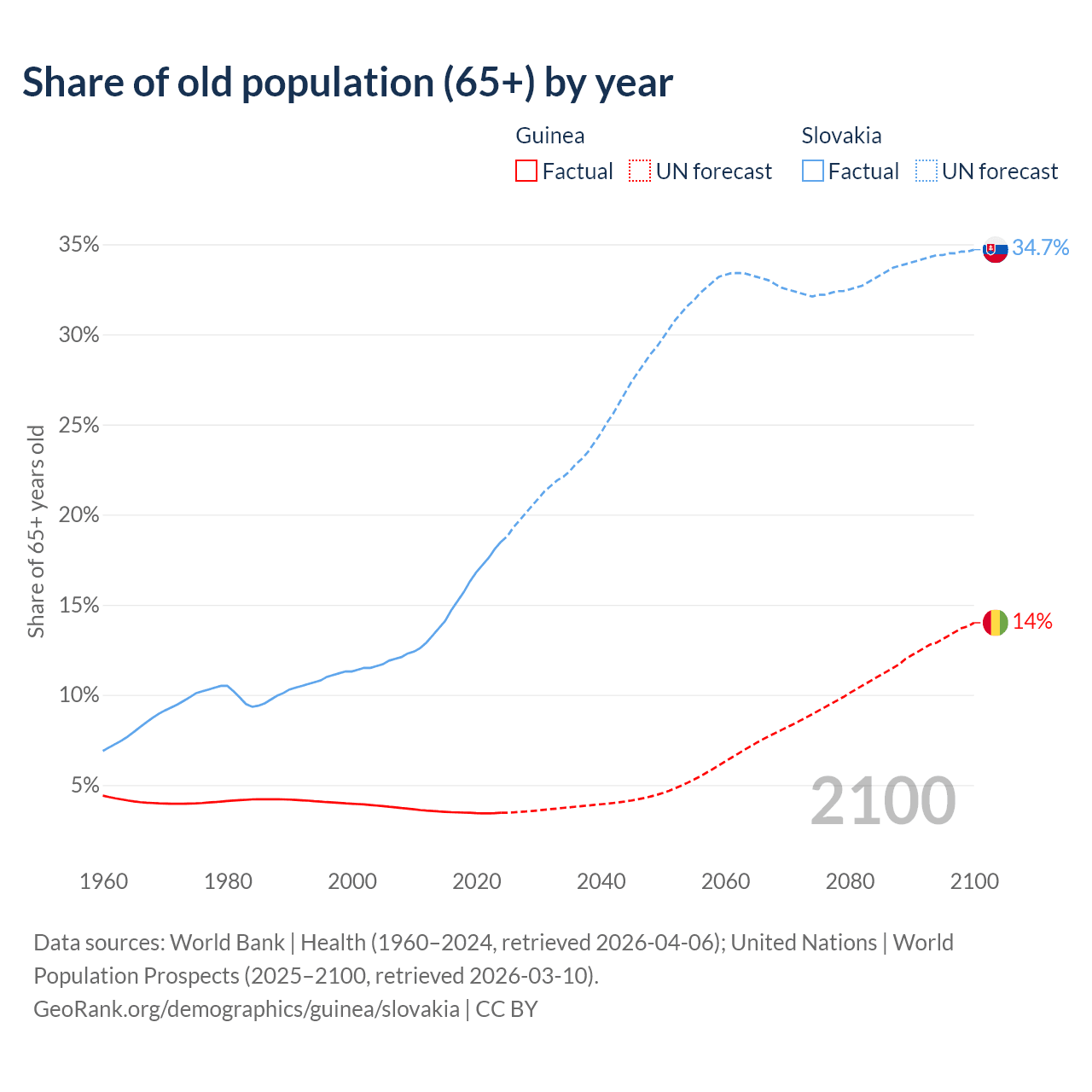 - The share of old-age demographic (65+) in Guinea is 3.46% vs 18.5% in Slovakia.