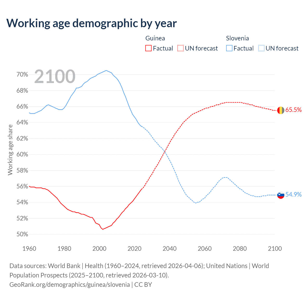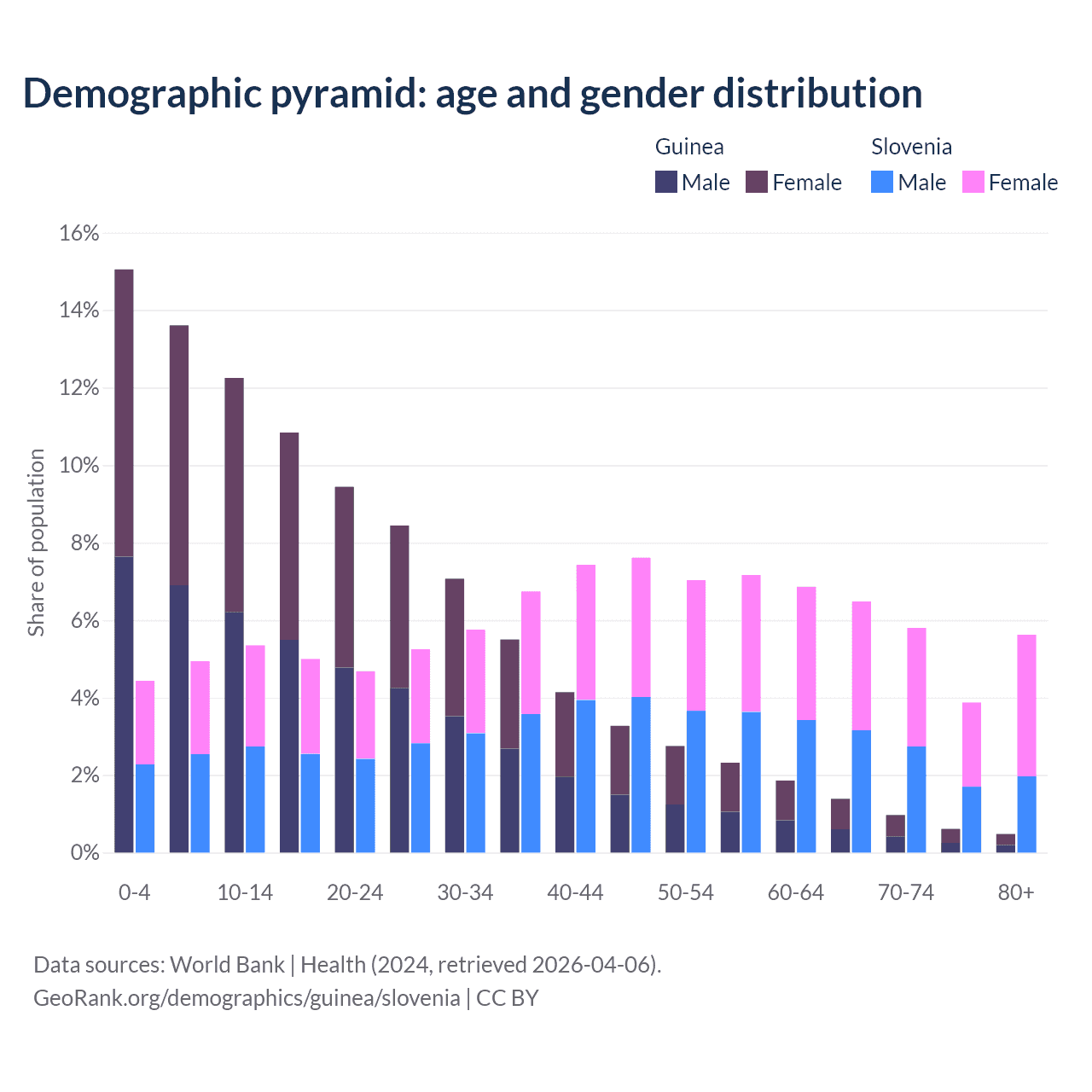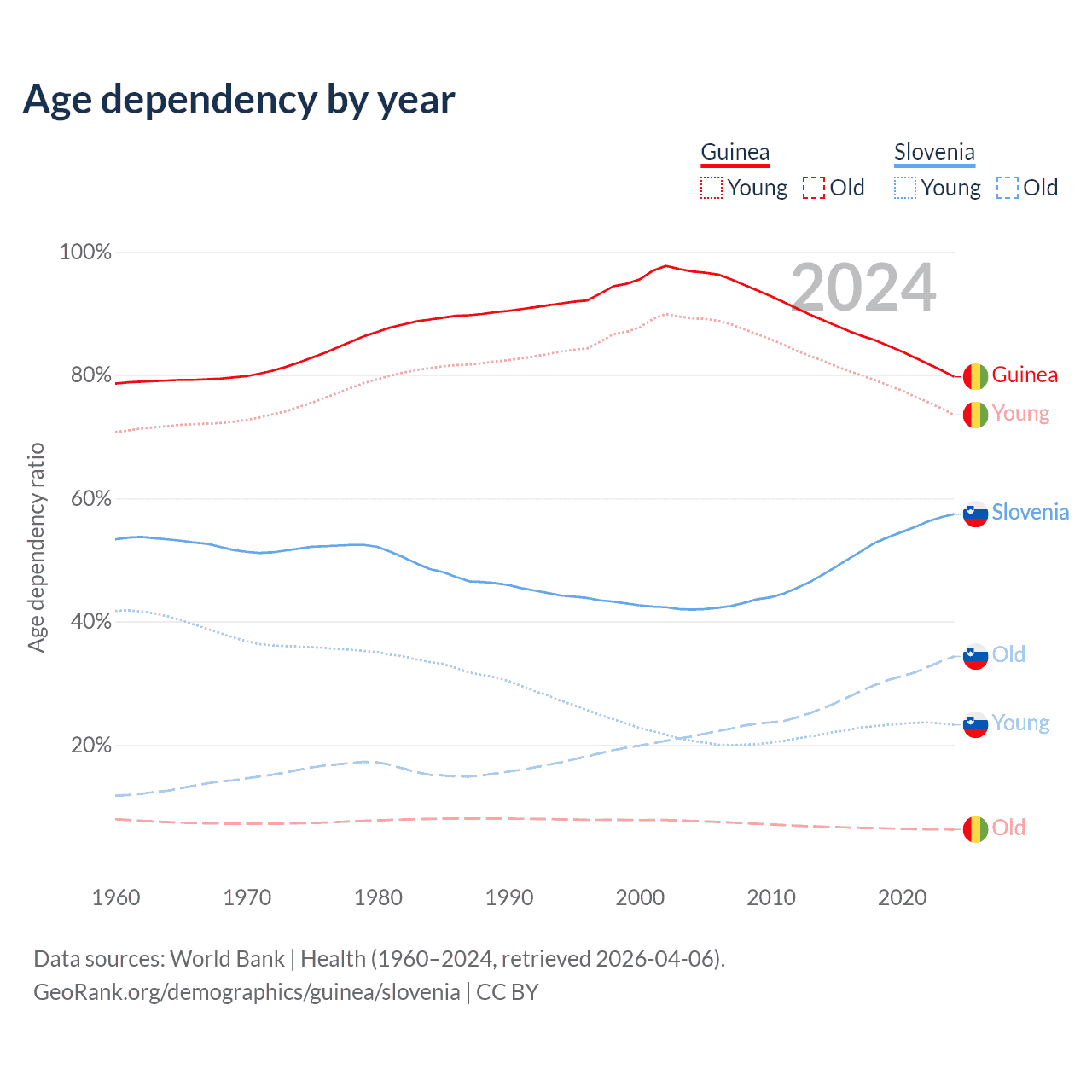 - The share of old-age demographic (65+) in Guinea is 3.46% vs 21.8% in Slovenia.
