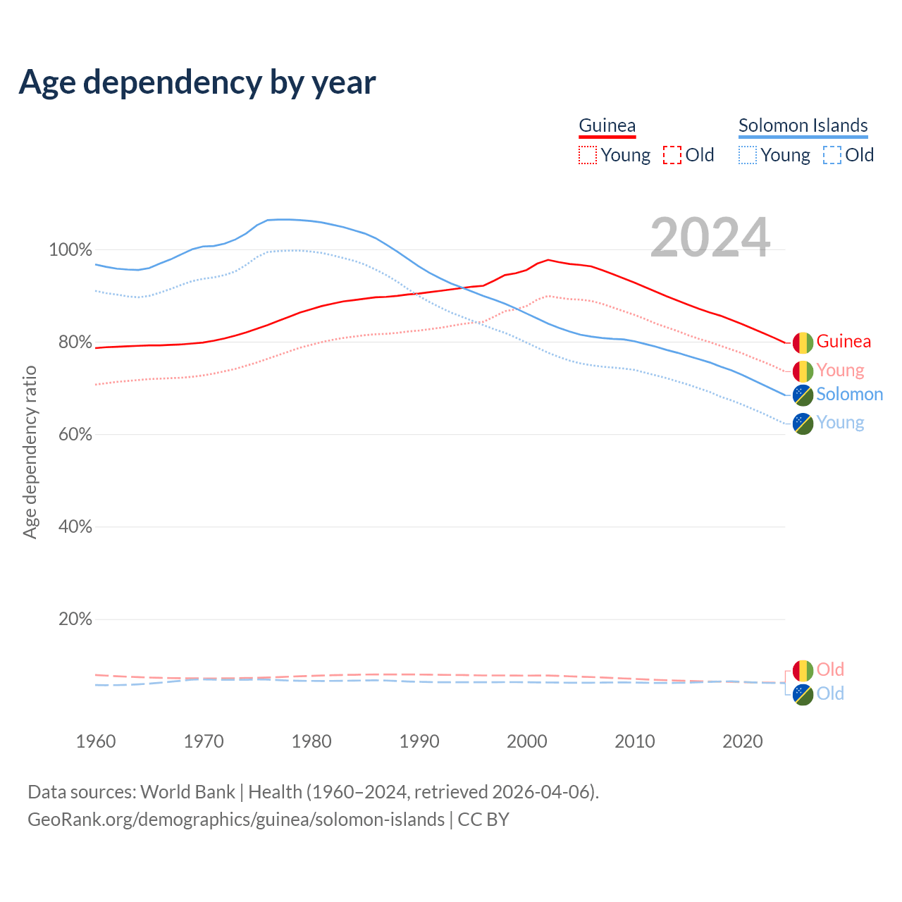 - Guinea is ranked 176/196 by median age (oldest to youngest) vs 153/196 for the Solomon Islands.