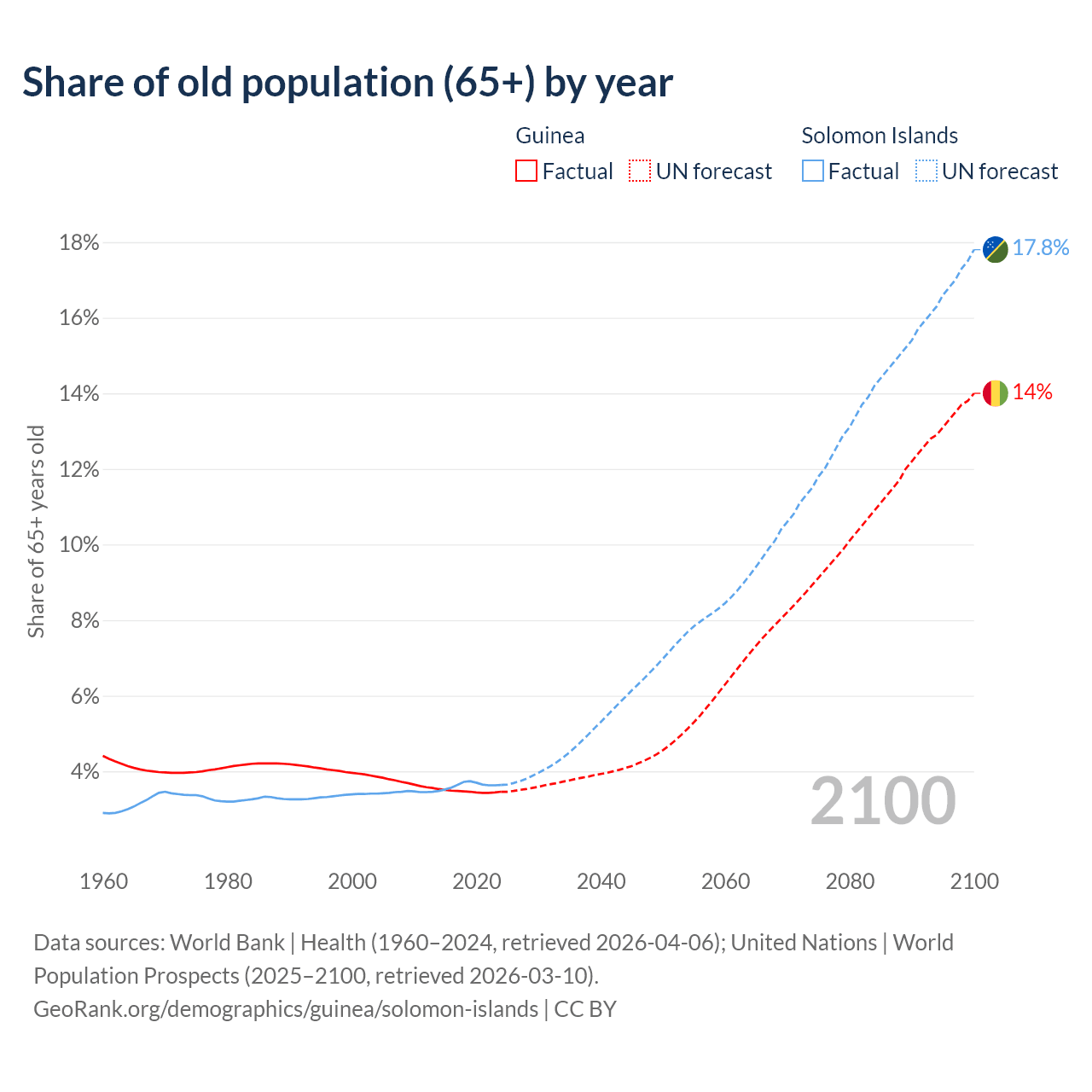 - The share of old-age demographic (65+) in Guinea is 3.46% vs 3.64% in the Solomon Islands.