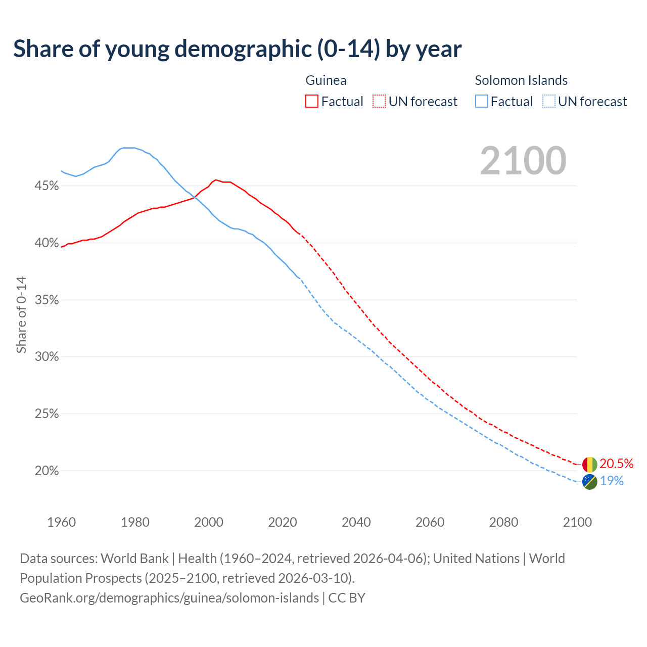 - As of 2026, the population of Guinea is 15.5M vs 864K in the Solomon Islands - 18 times difference.