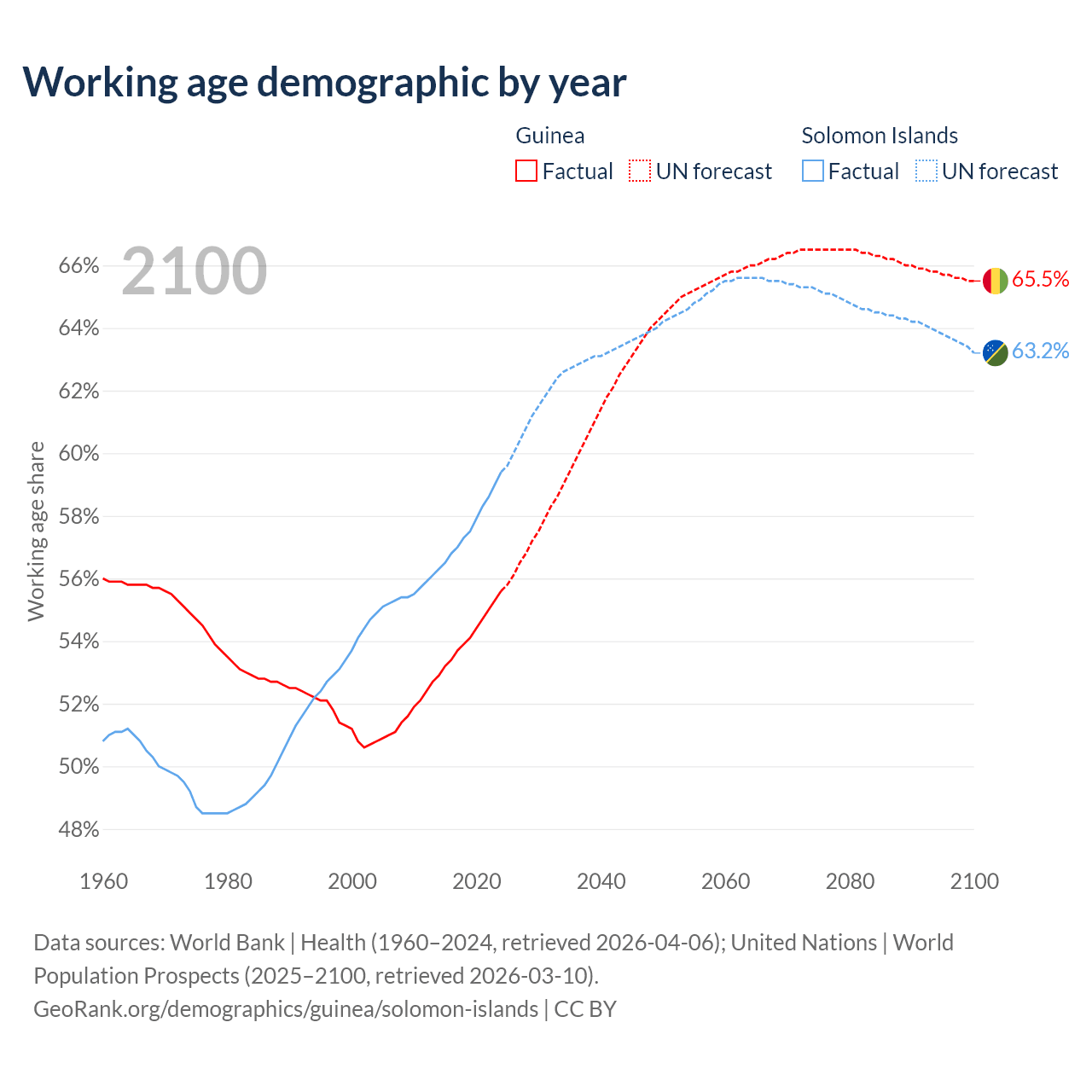- Guinea has 8.65M working age adults (aged 15-64) vs 513K in the Solomon Islands.