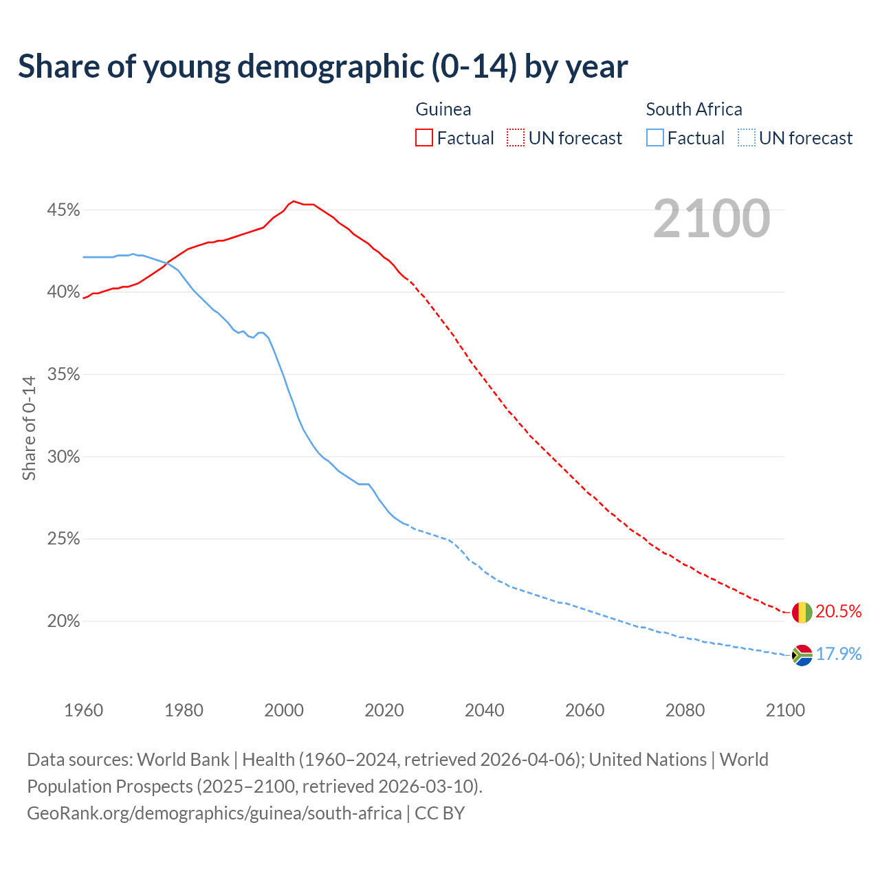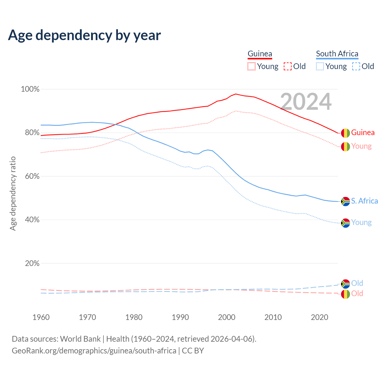 - Guinea is ranked 176/196 by median age (oldest to youngest) vs 107/196 for South Africa.