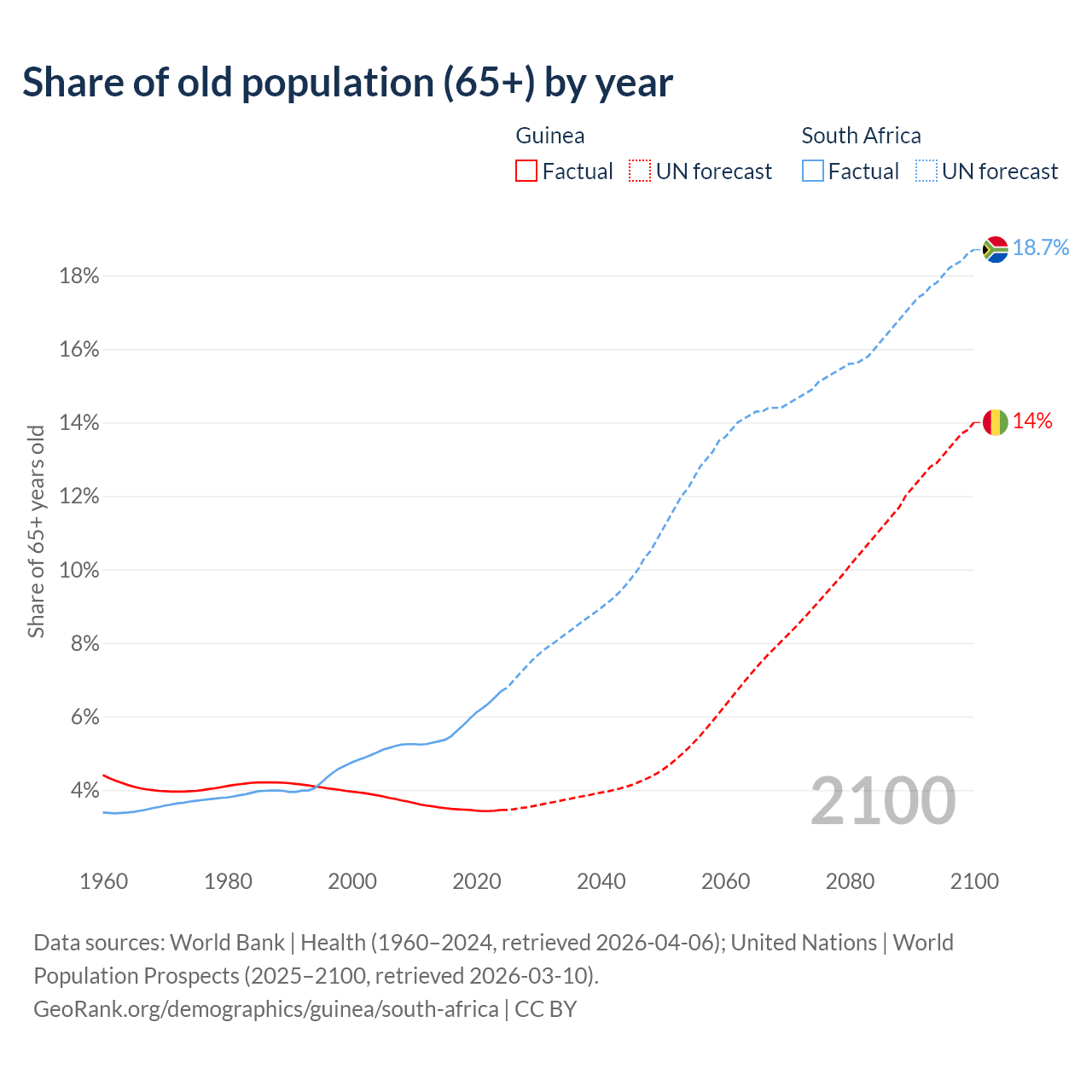 The share of older people aged 65 and over is 3.46% in Guinea and 6.69% in South Africa. Life expectancy in Guinea compared to South Africa .