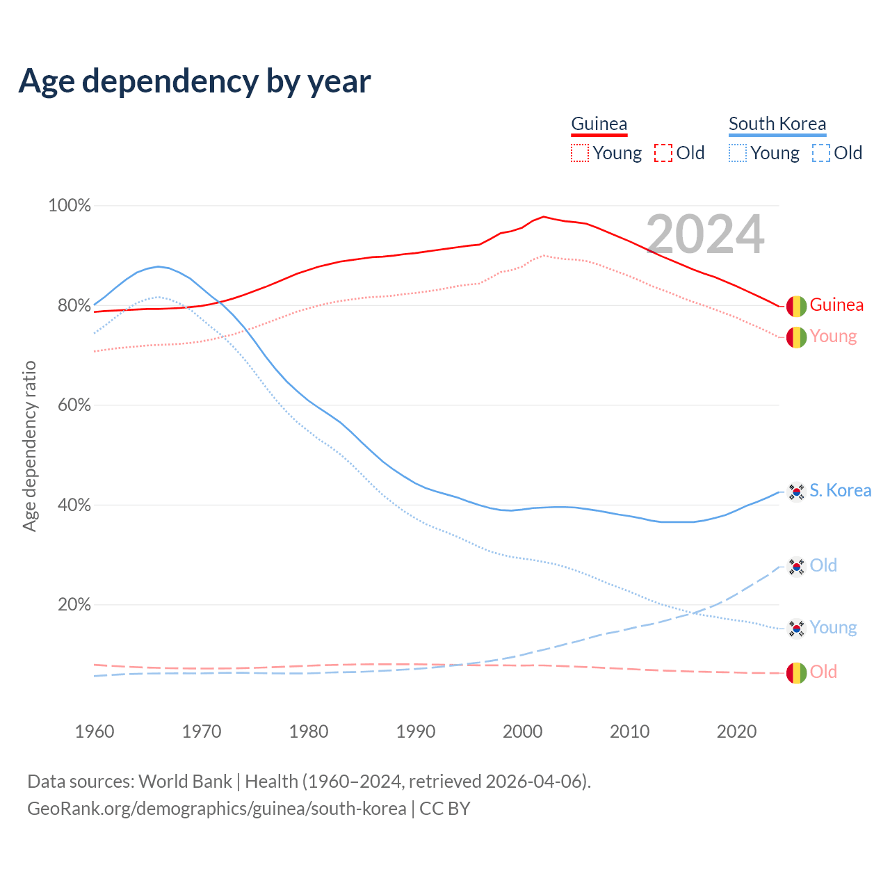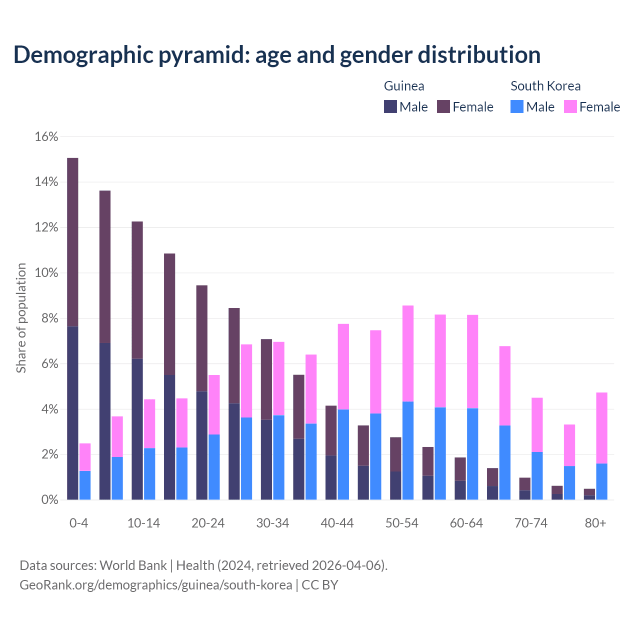 - Guinea is ranked 176/196 by median age (oldest to youngest) vs 10/196 for South Korea.