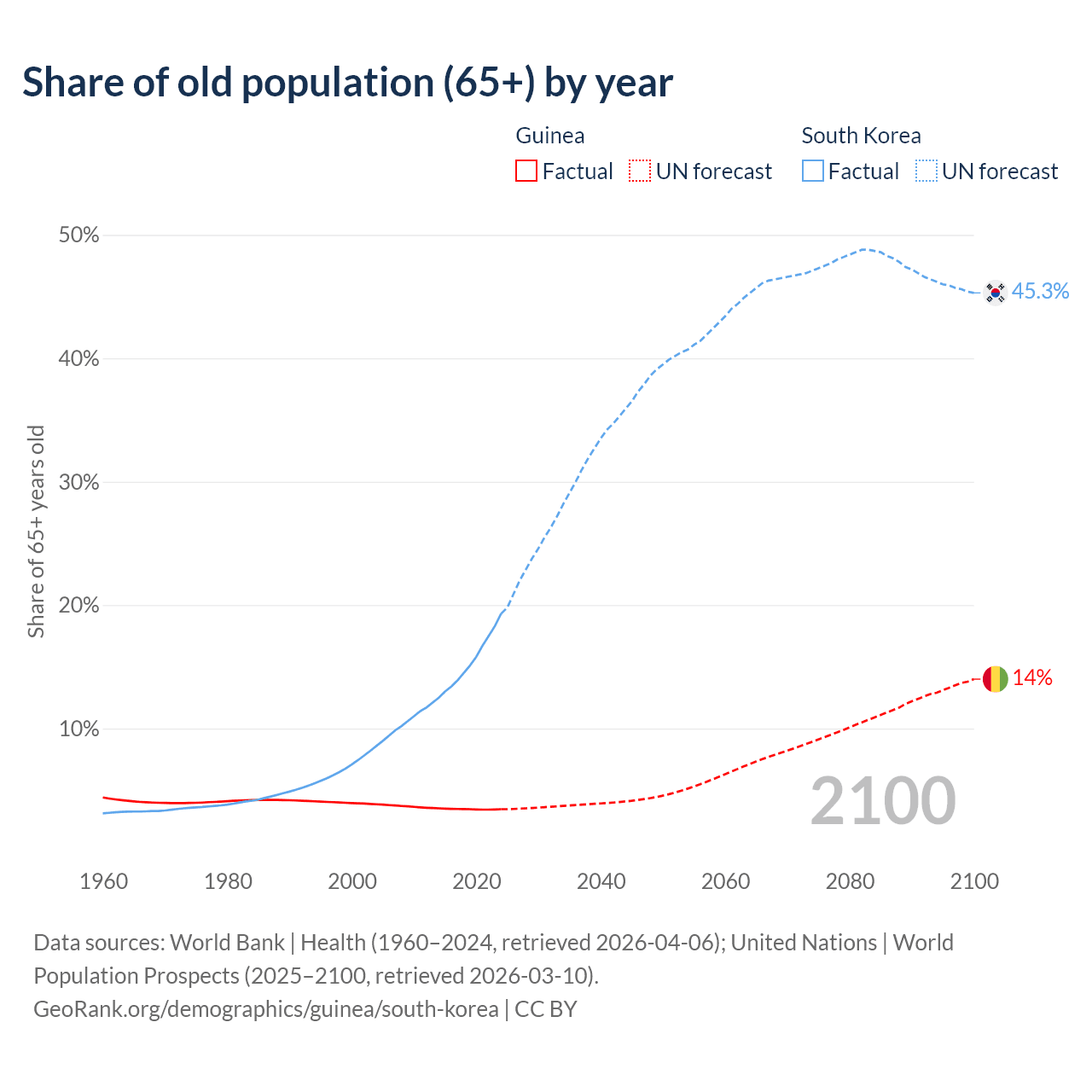 The share of older people aged 65 and over is 3.46% in Guinea and 19.3% in South Korea. Life expectancy in Guinea compared to South Korea .
