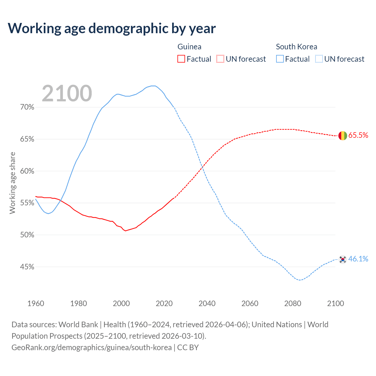 - Guinea has 8.65M working age adults (aged 15-64) vs 36.2M in South Korea.