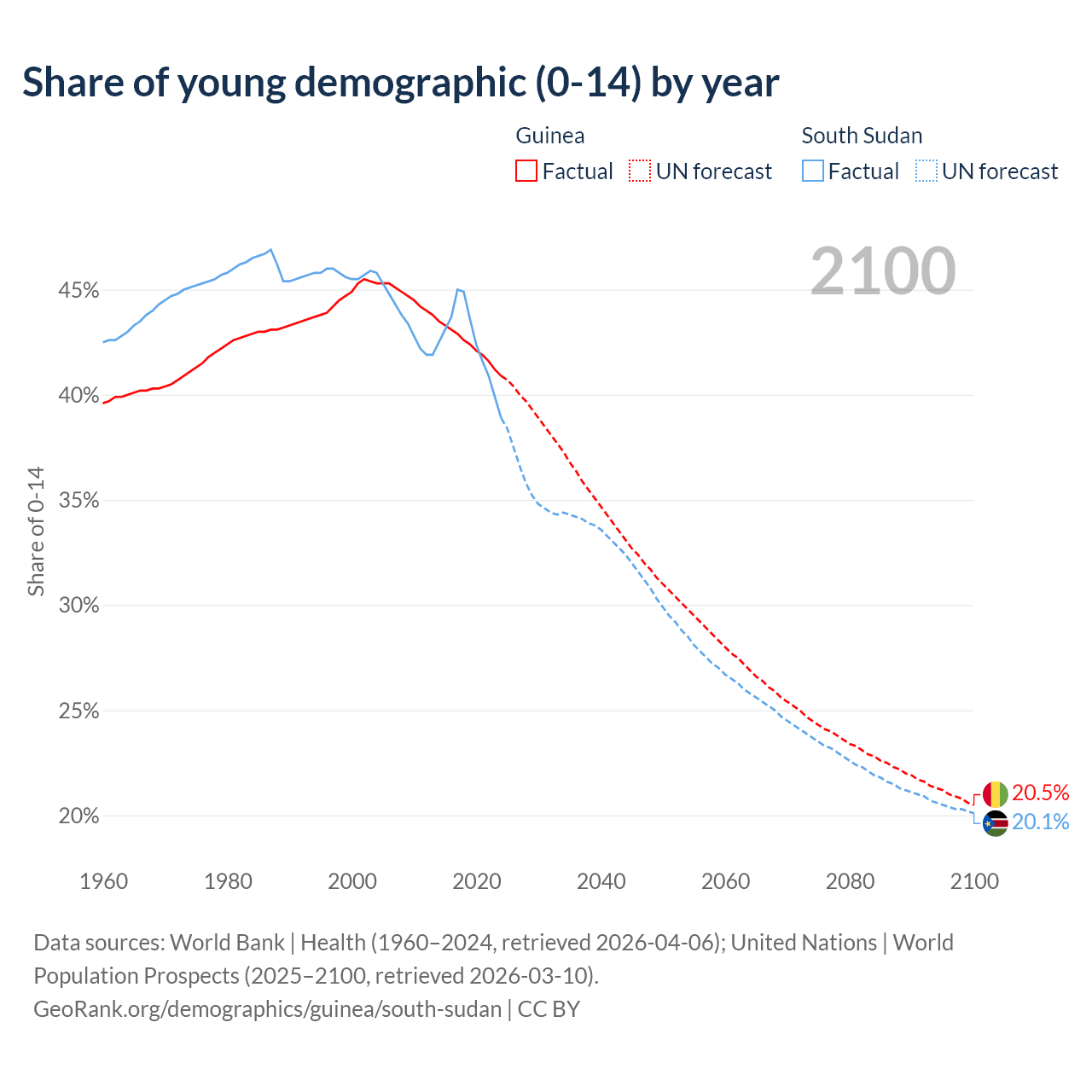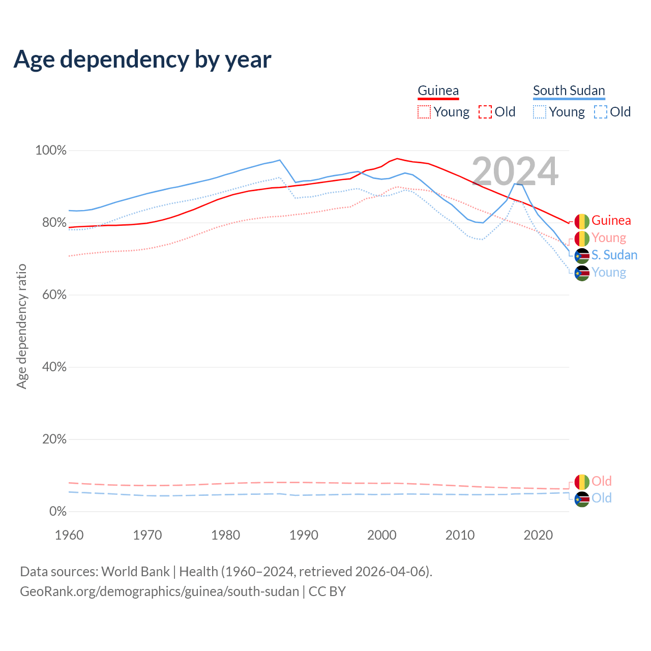 - Guinea is ranked 176/196 by median age (oldest to youngest) vs 173/196 for South Sudan.