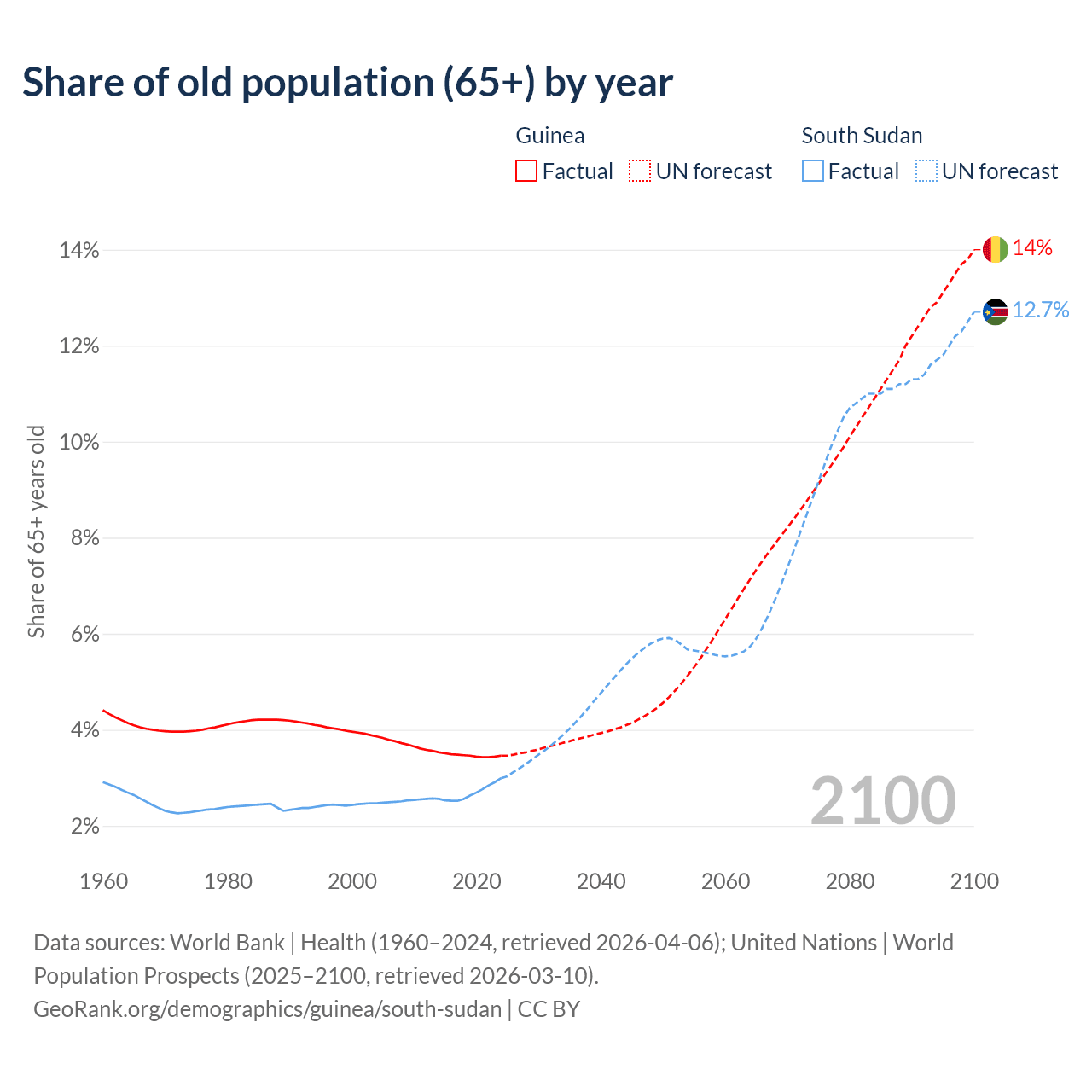 - The share of old-age demographic (65+) in Guinea is 3.46% vs 2.99% in South Sudan.