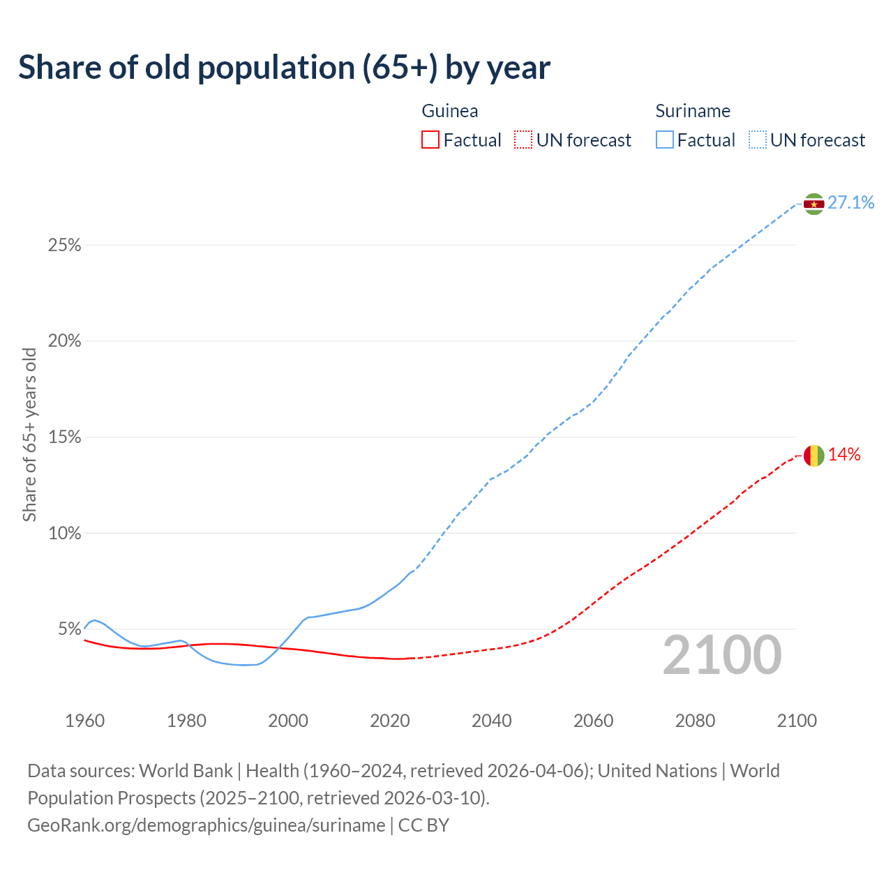 - The share of old-age demographic (65+) in Guinea is 3.46% vs 7.9% in Suriname.