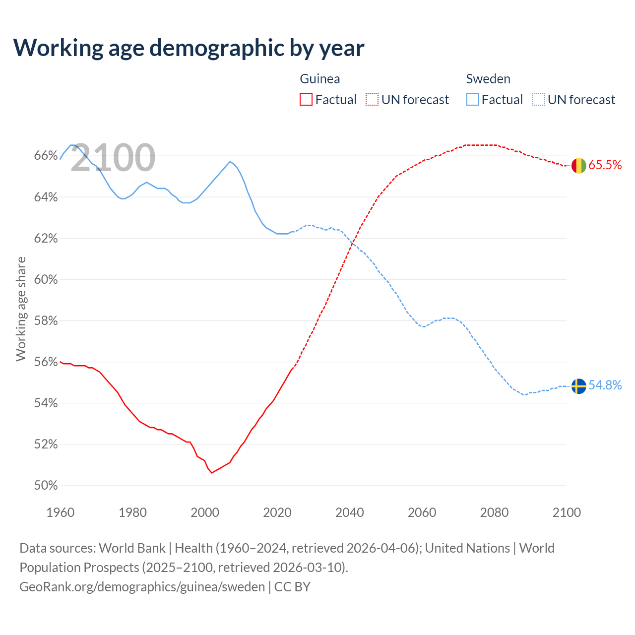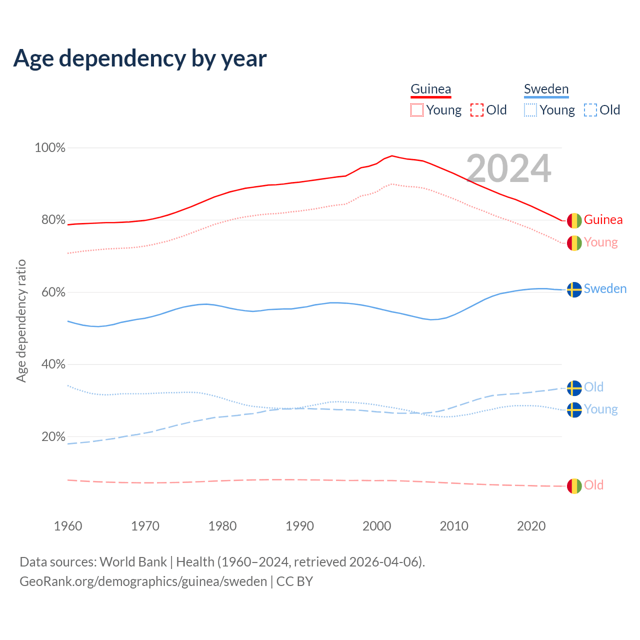 - The share of old-age demographic (65+) in Guinea is 3.46% vs 20.7% in Sweden.