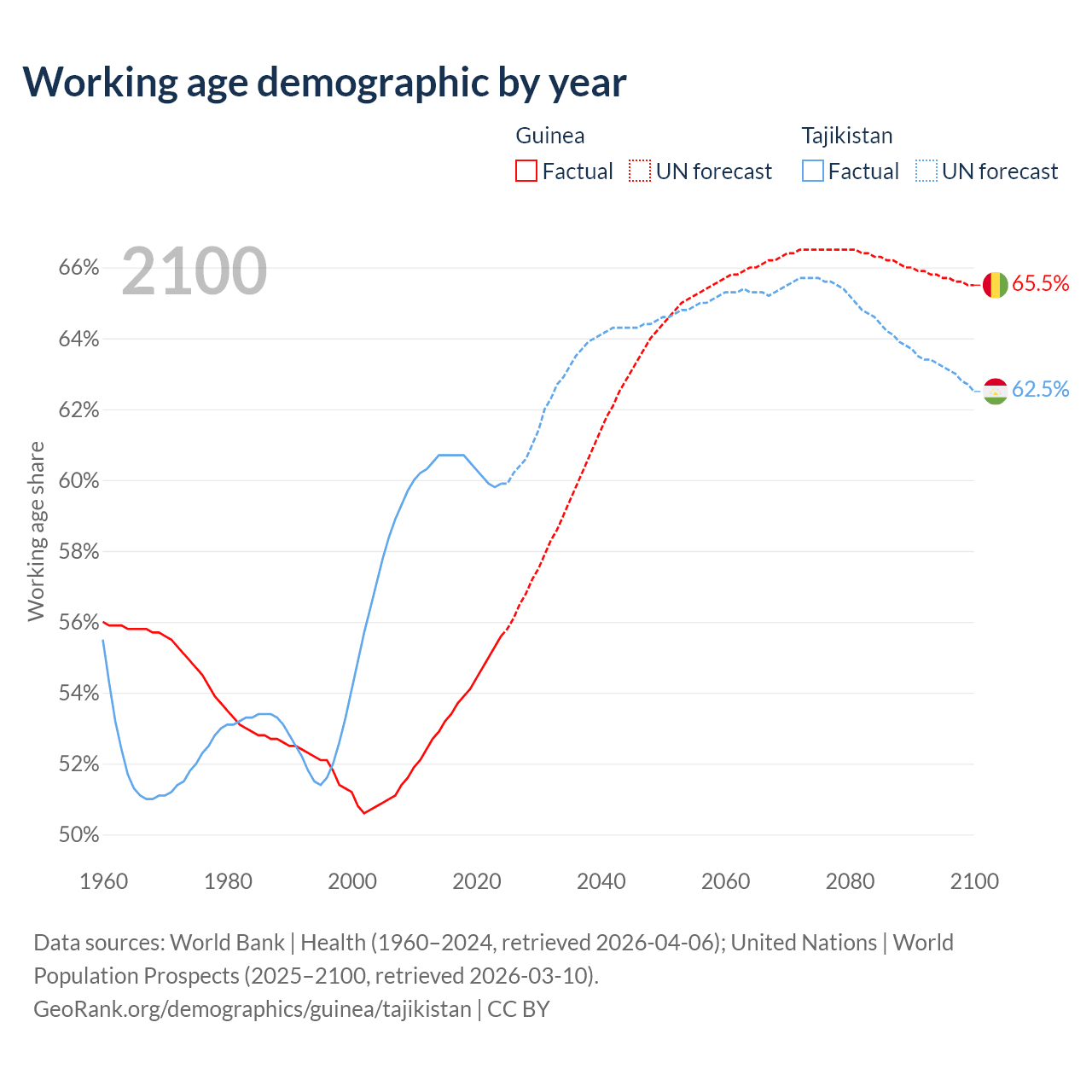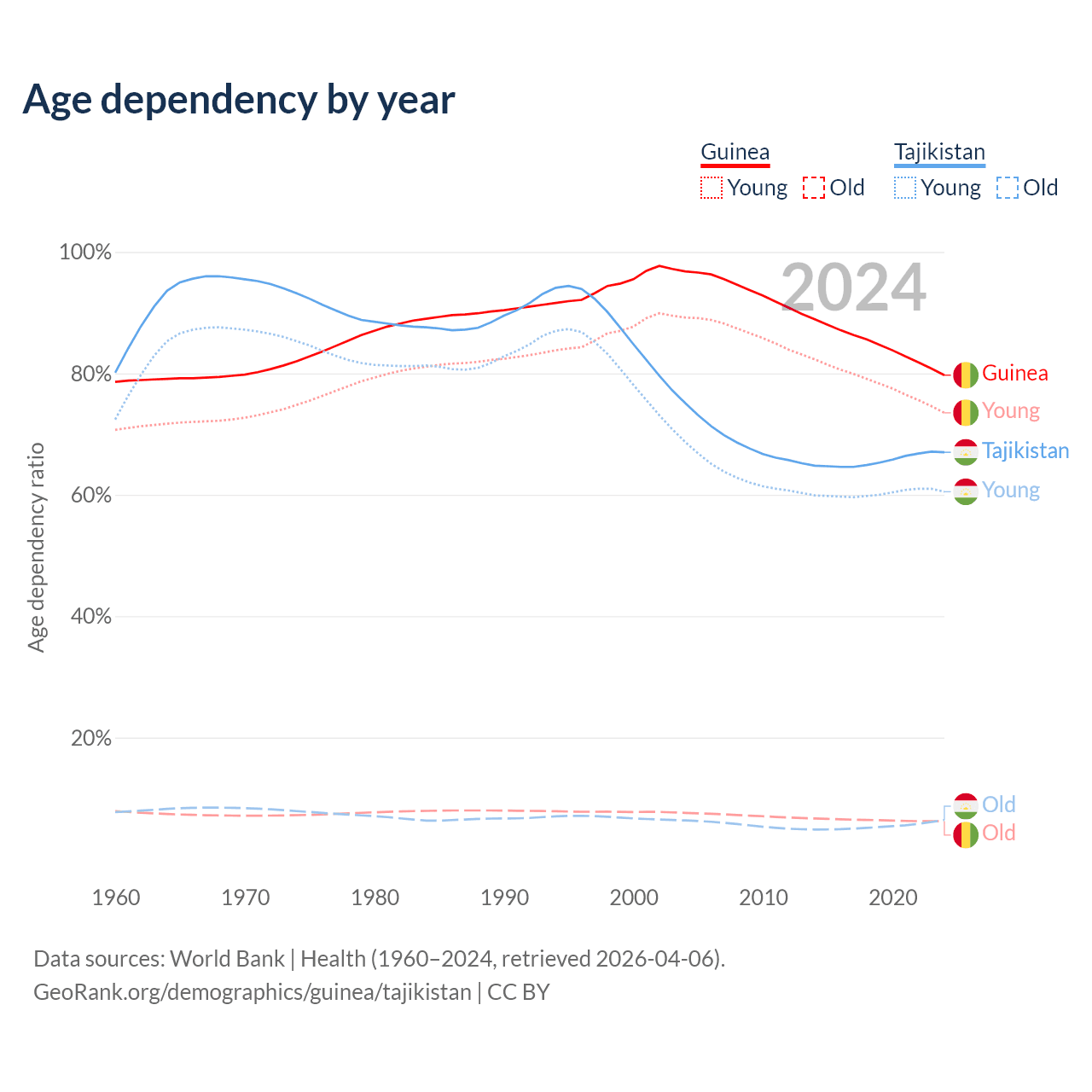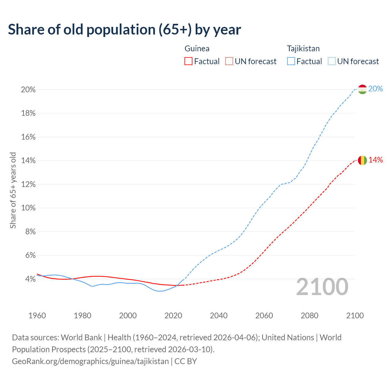 - The share of old-age demographic (65+) in Guinea is 3.46% vs 3.85% in Tajikistan.