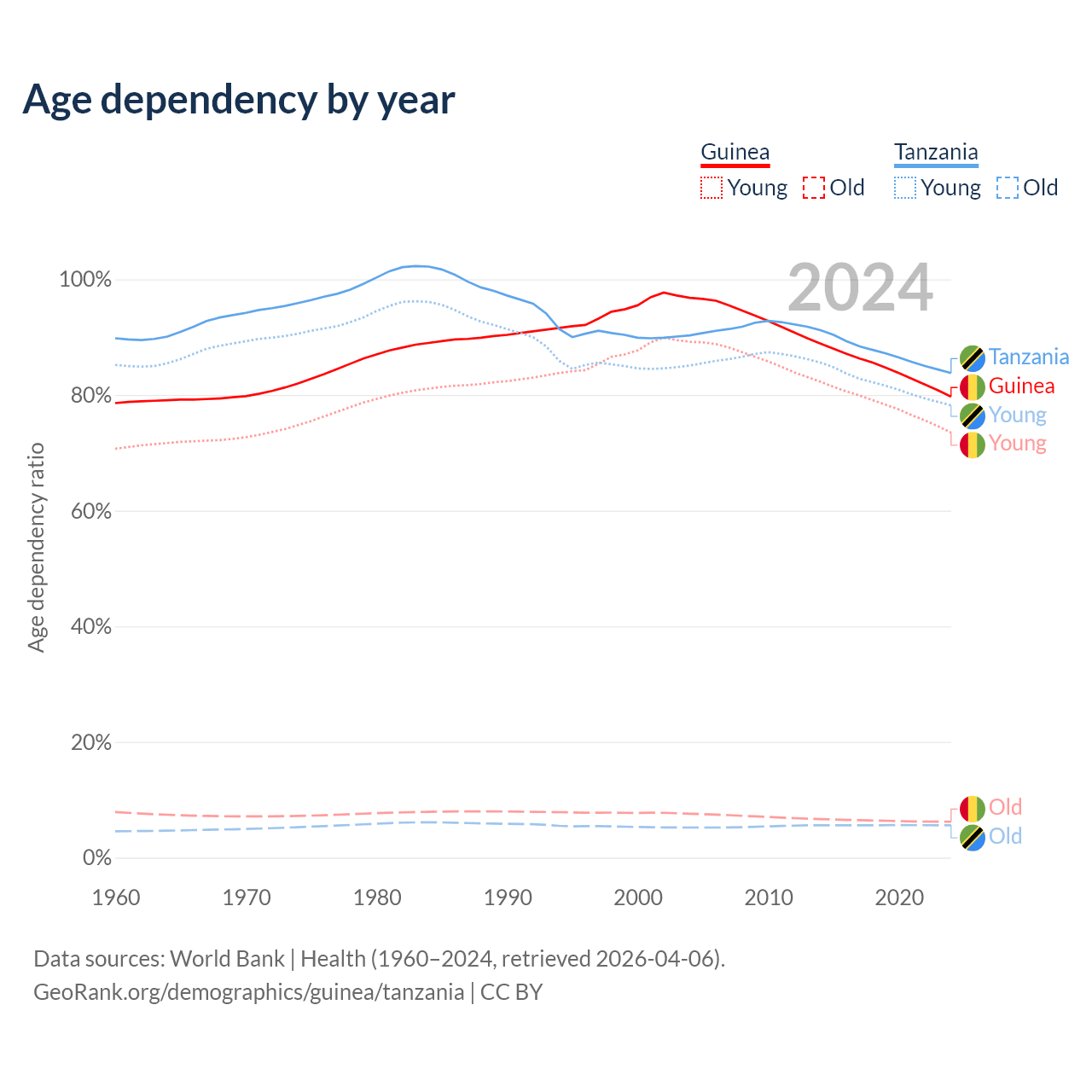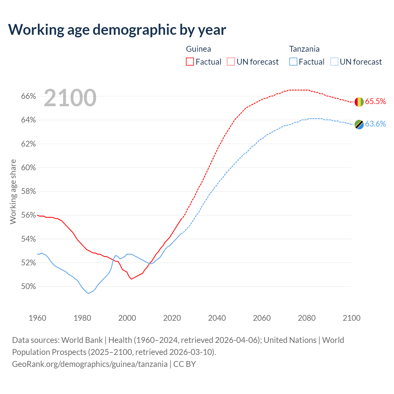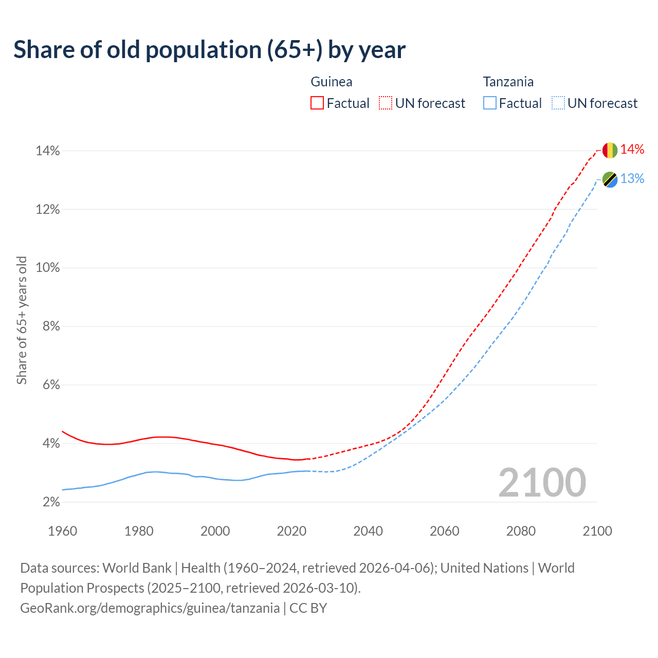 The share of older people aged 65 and over is 3.46% in Guinea and 3.05% in Tanzania. Life expectancy in Guinea compared to Tanzania .