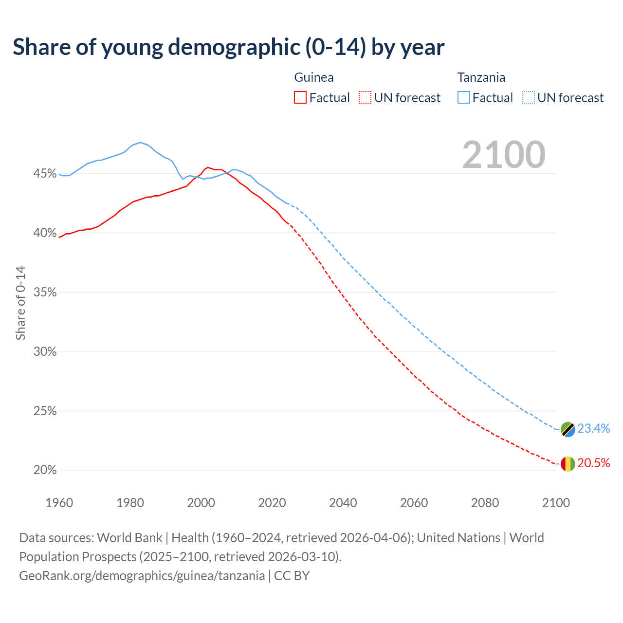 Median age Guinea vs Tanzania, 1960-2100