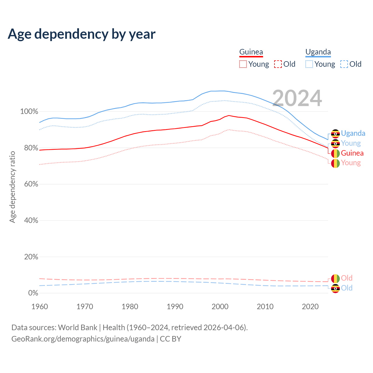 - Guinea is ranked 176/196 by median age (oldest to youngest) vs 187/196 for Uganda.