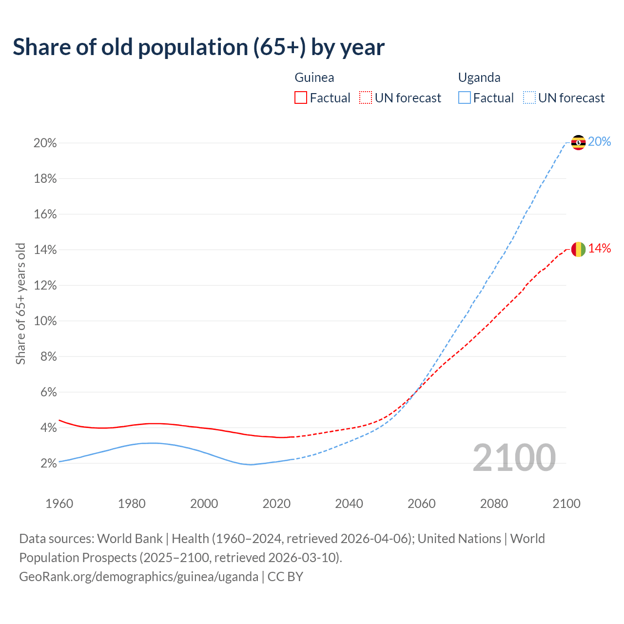 The share of older people aged 65 and over is 3.46% in Guinea and 2.19% in Uganda. Life expectancy in Guinea compared to Uganda .