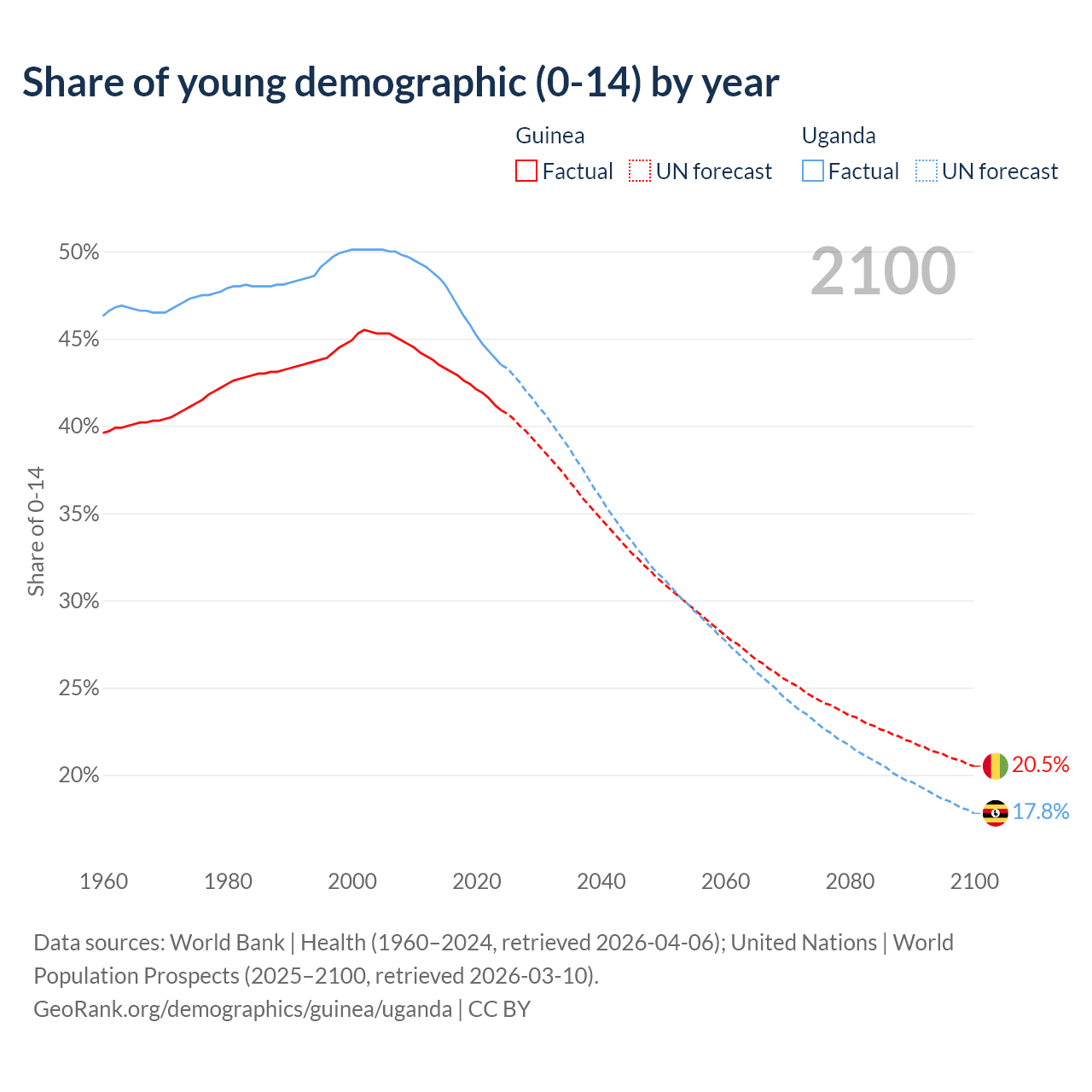 - As of 2026, the population of Guinea is 15.5M vs 53.2M in Uganda - 3.42 times difference.
