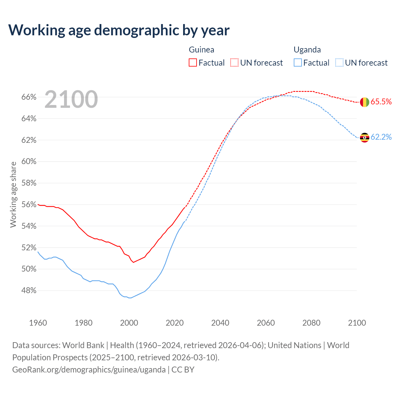 - The share of old-age demographic (65+) in Guinea is 3.46% vs 2.19% in Uganda.