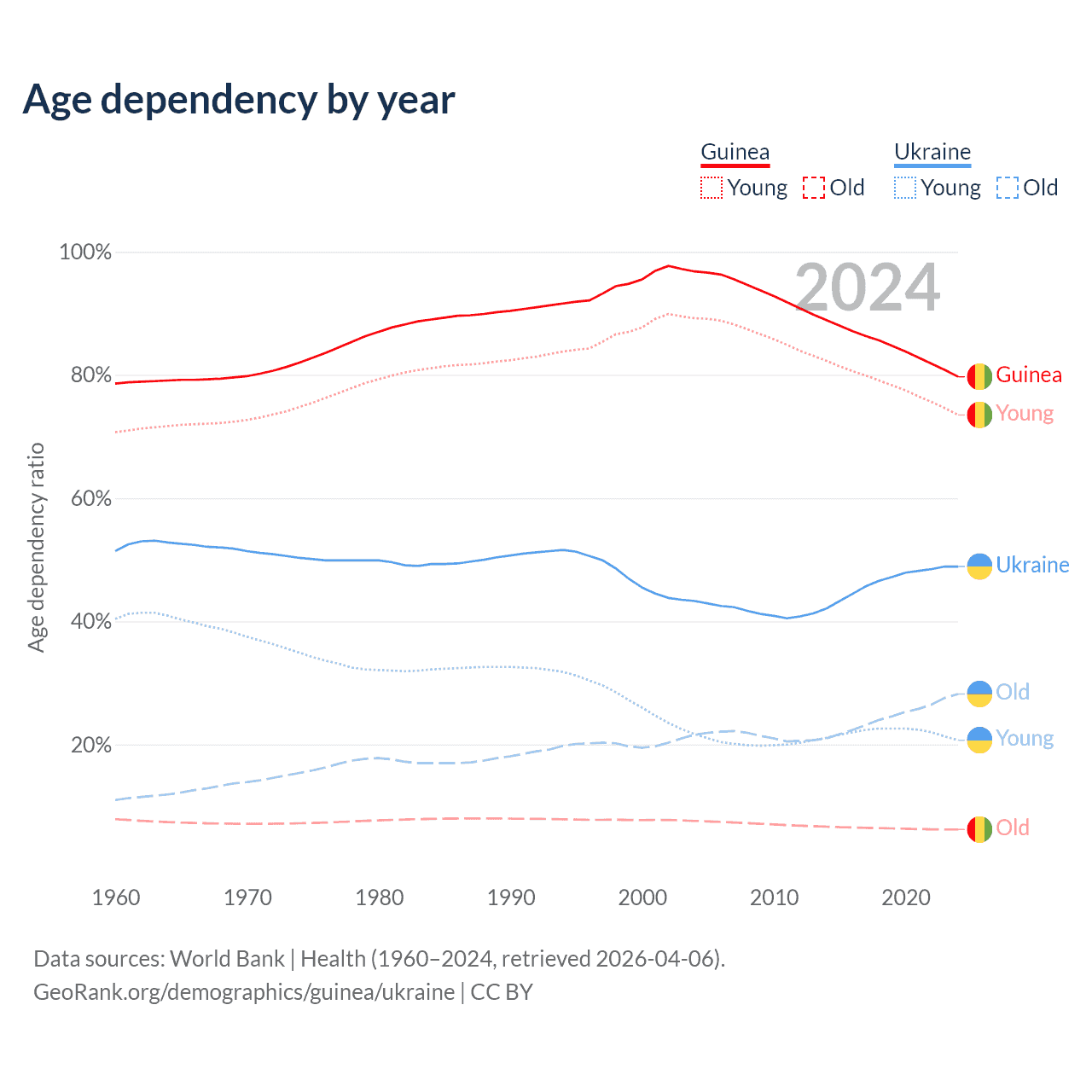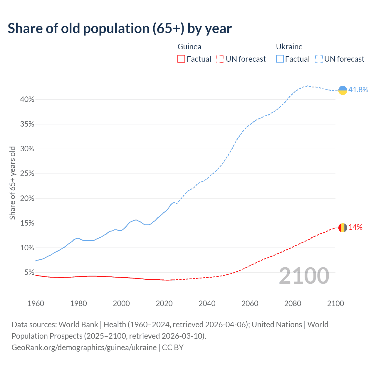 The share of older people aged 65 and over is 3.46% in Guinea and 19% in Ukraine. Life expectancy in Guinea compared to Ukraine .