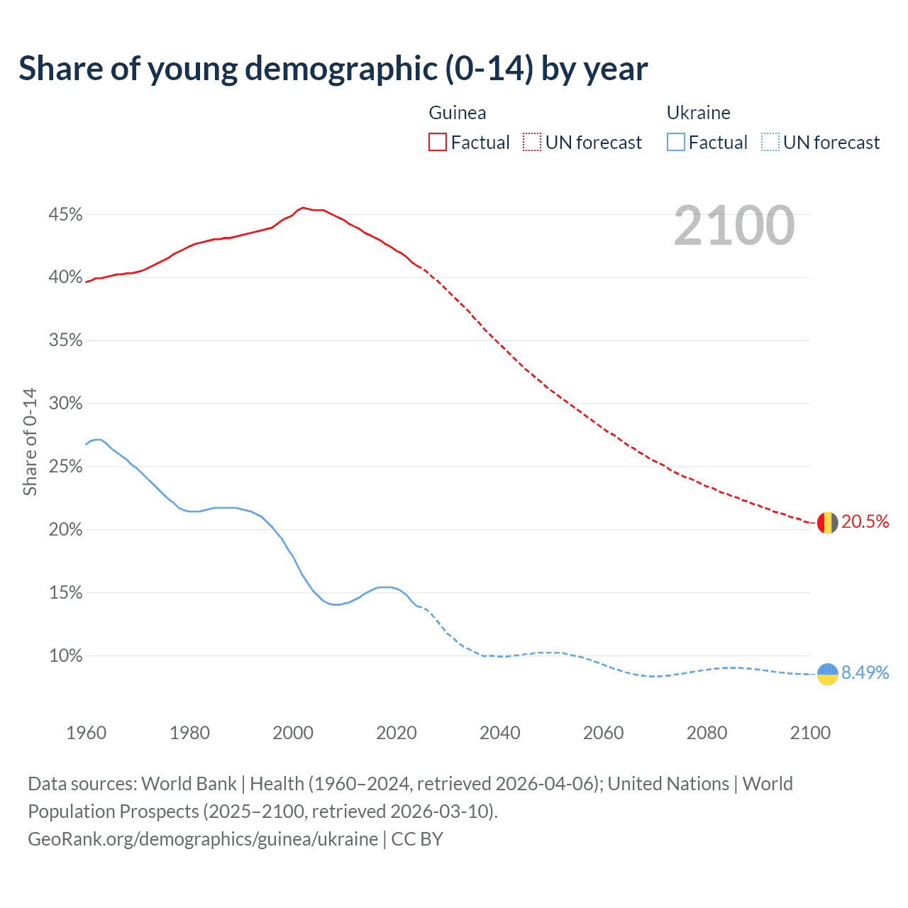 - The share of young demographic (0-15 years old) in Guinea is 40.9% vs 13.9% in Ukraine.