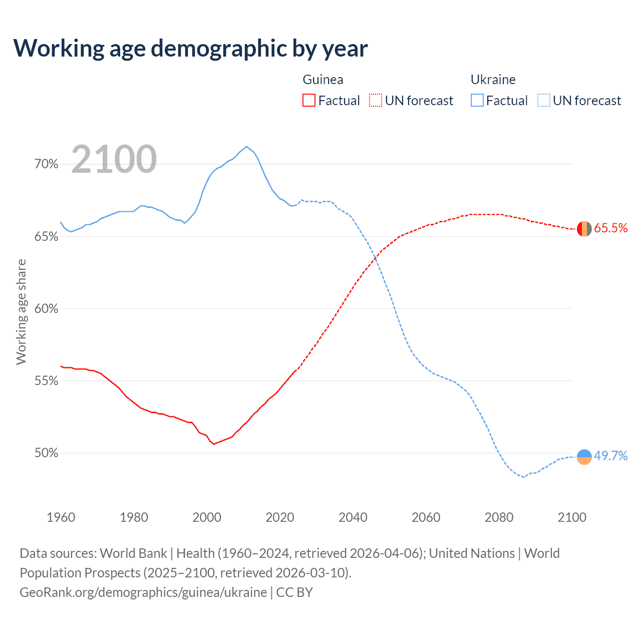 Median age Guinea vs Ukraine, 1960-2100