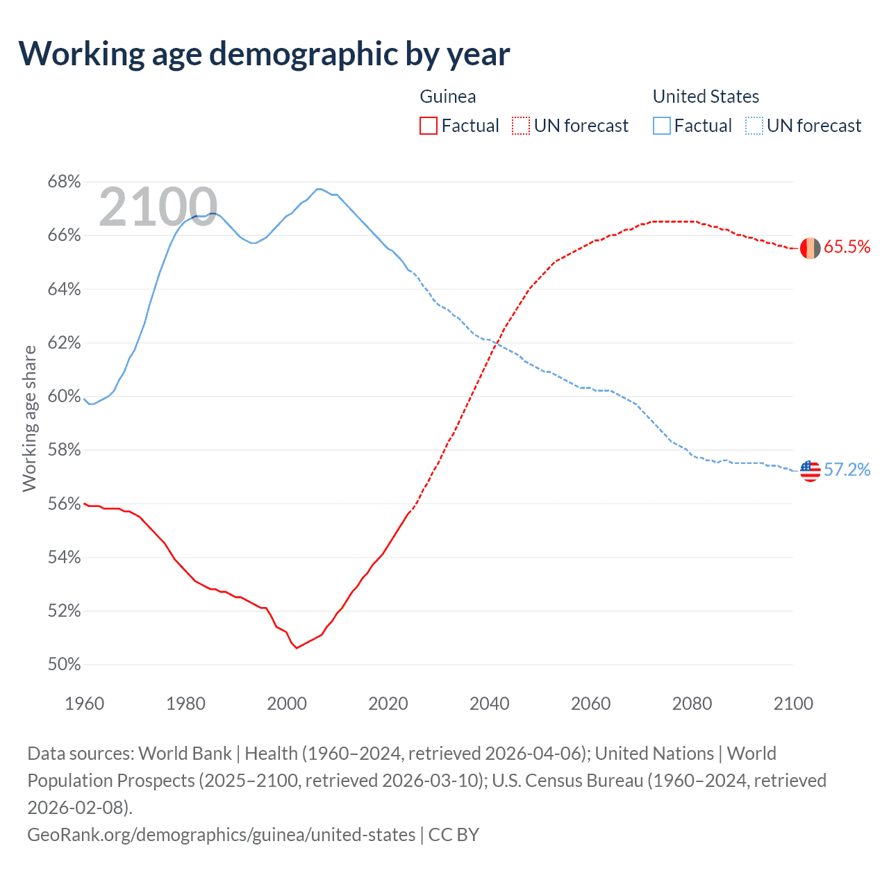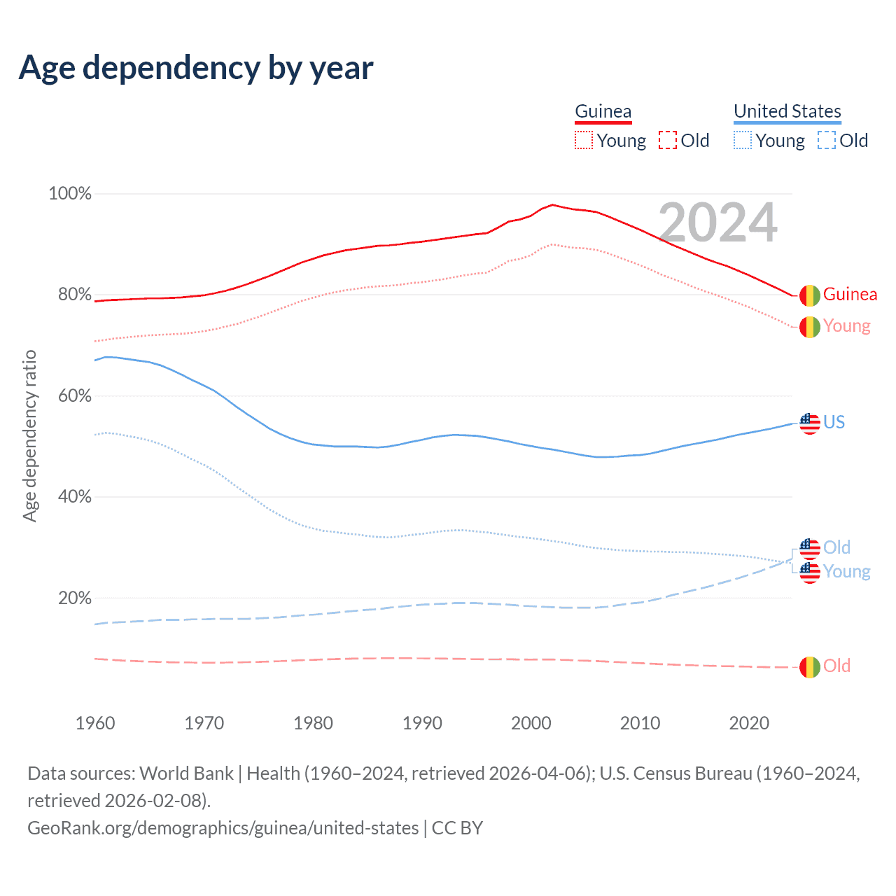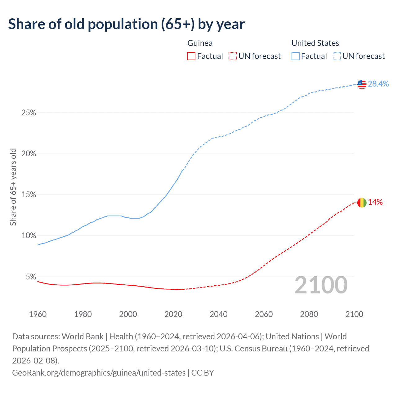 - The share of old-age demographic (65+) in Guinea is 3.46% vs 17.9% in the United States.