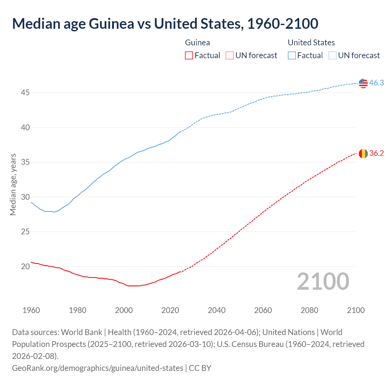 - Guinea is ranked 176/196 by median age (oldest to youngest) vs 50/196 for the United States.