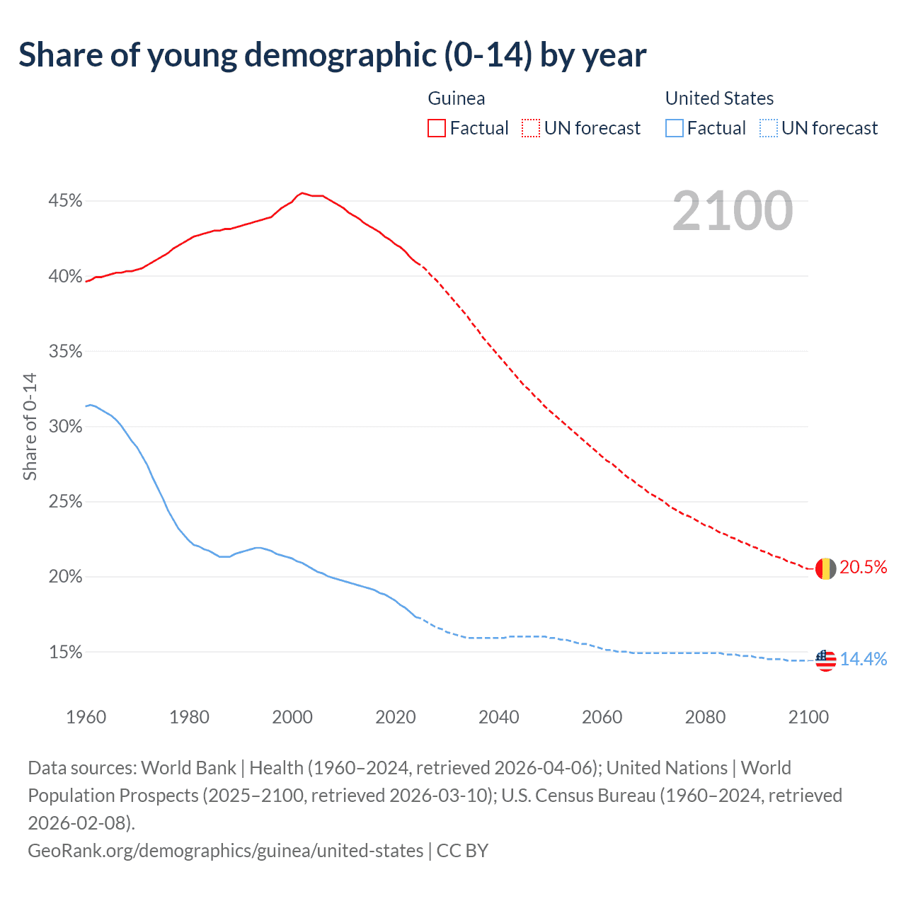 - The share of young demographic (0-15 years old) in Guinea is 40.9% vs 17.3% in the United States.