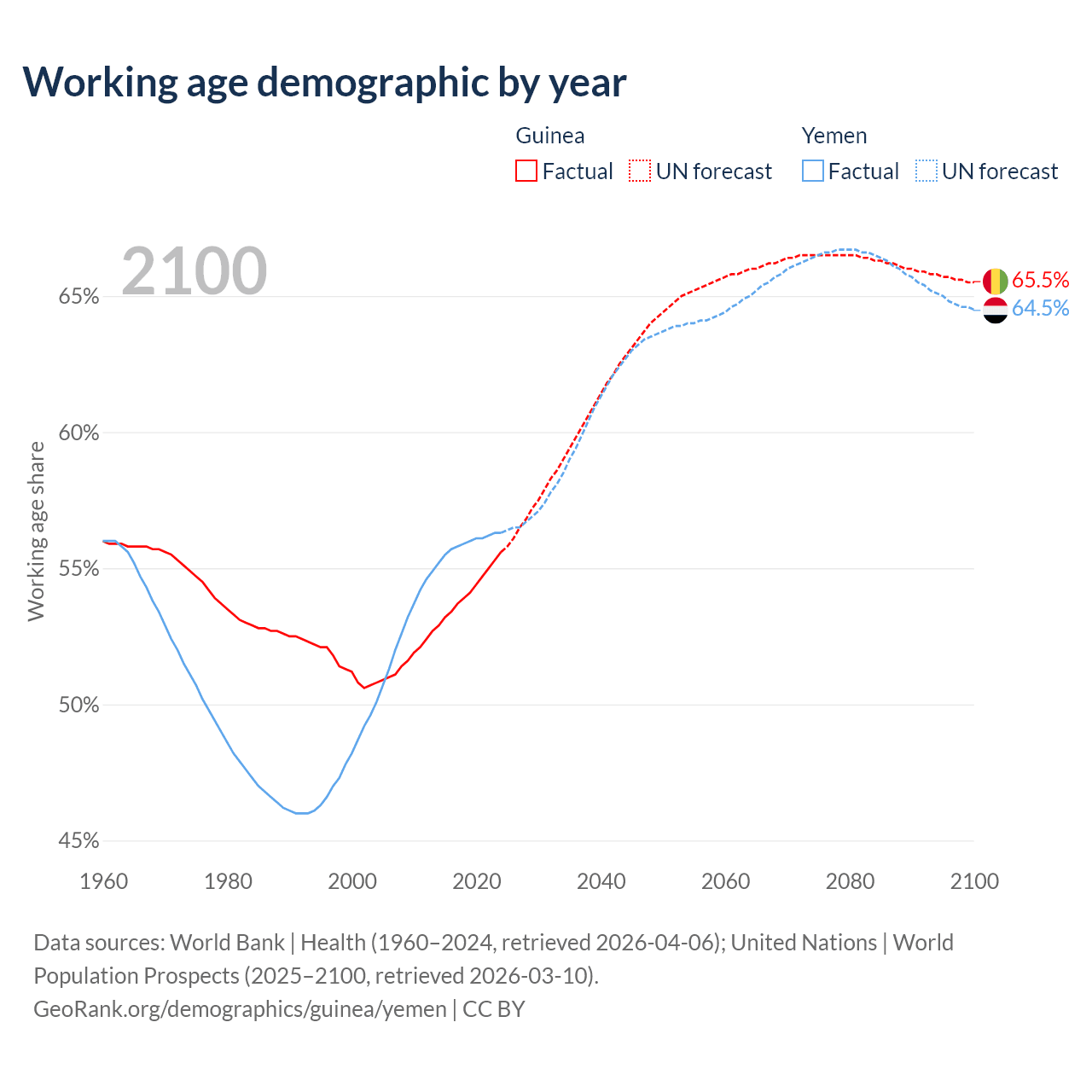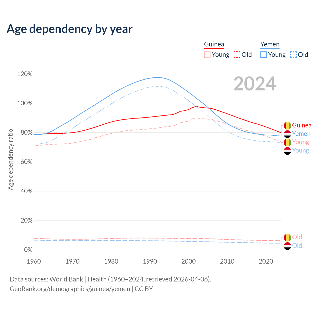 - The share of old-age demographic (65+) in Guinea is 3.46% vs 2.52% in Yemen.