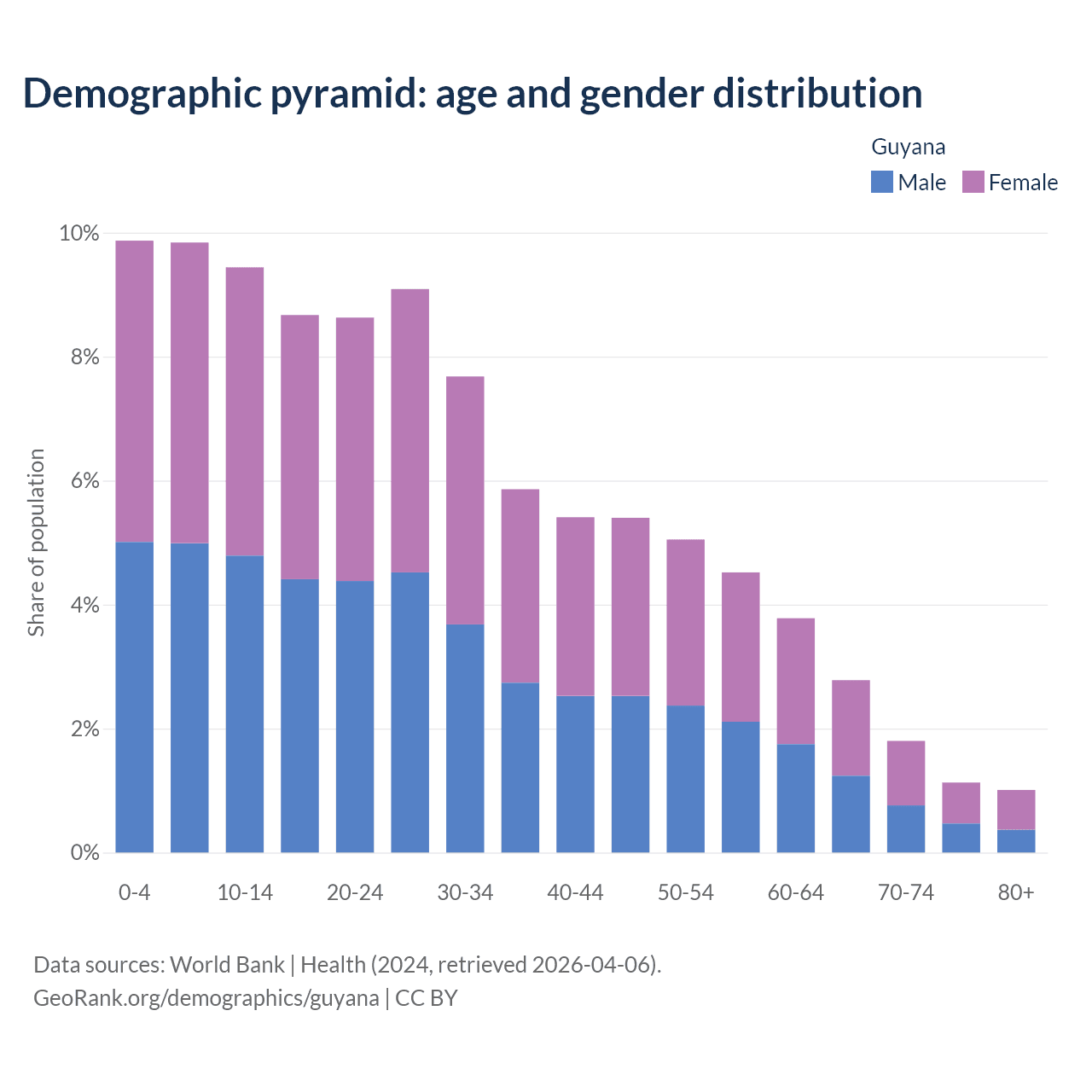 With a population of 831K people, Guyana has a median age of 26.9 years which makes it the 122/196 oldest country. 29.2% of the demographic are children 0-14 years old, 64.1% are working-age people aged 15-64, and 6.73% are older population aged 65+ years.