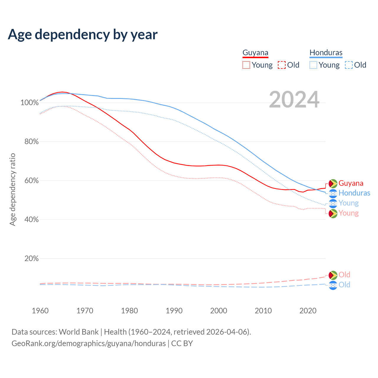 Data sources: World Bank | Health (1960–2024, retrieved 2026-04-06); U.S. Census Bureau (1960–2024, retrieved 2026-02-08).