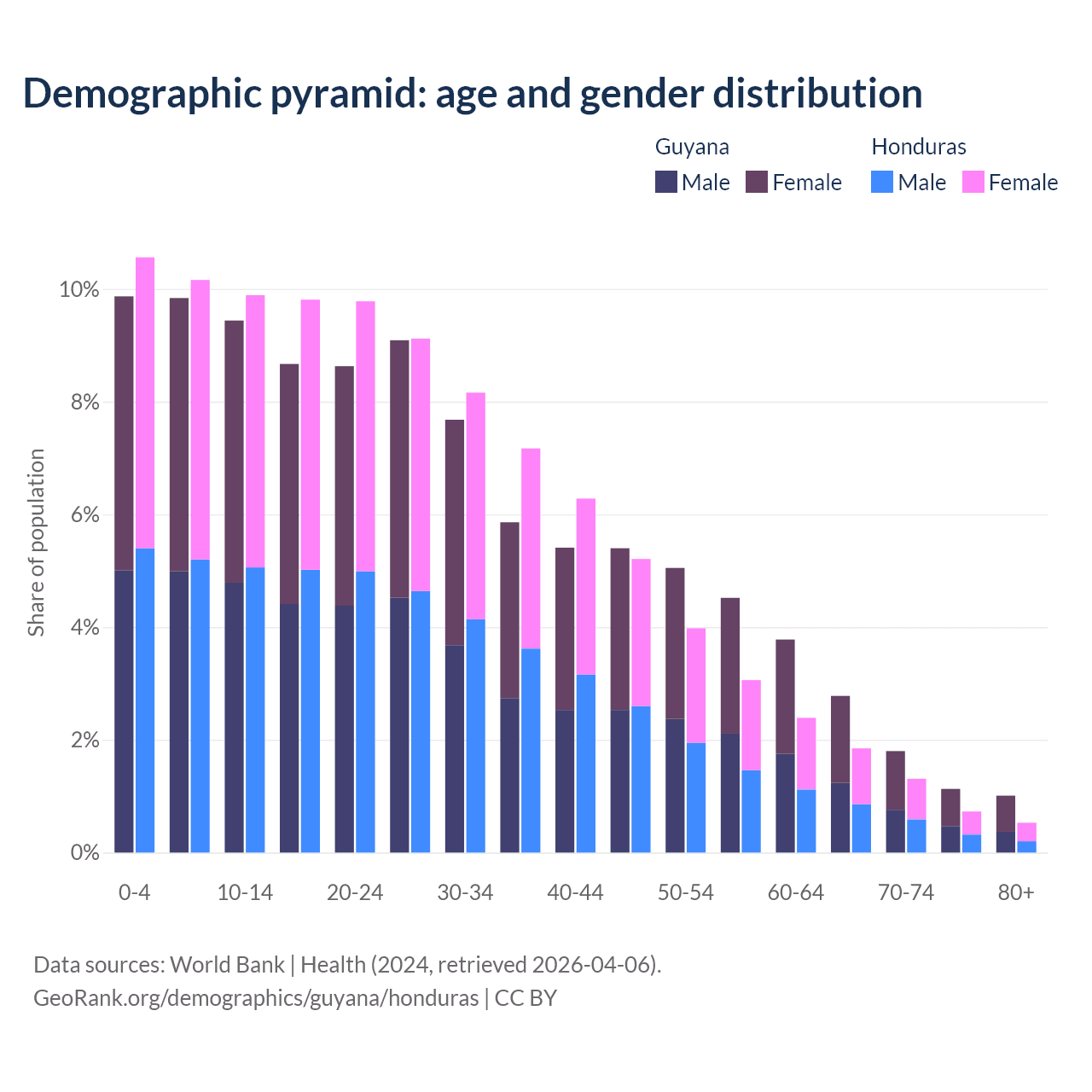 - The share of old-age demographic (65+) in Guyana is 6.73% vs 4.42% in Honduras.