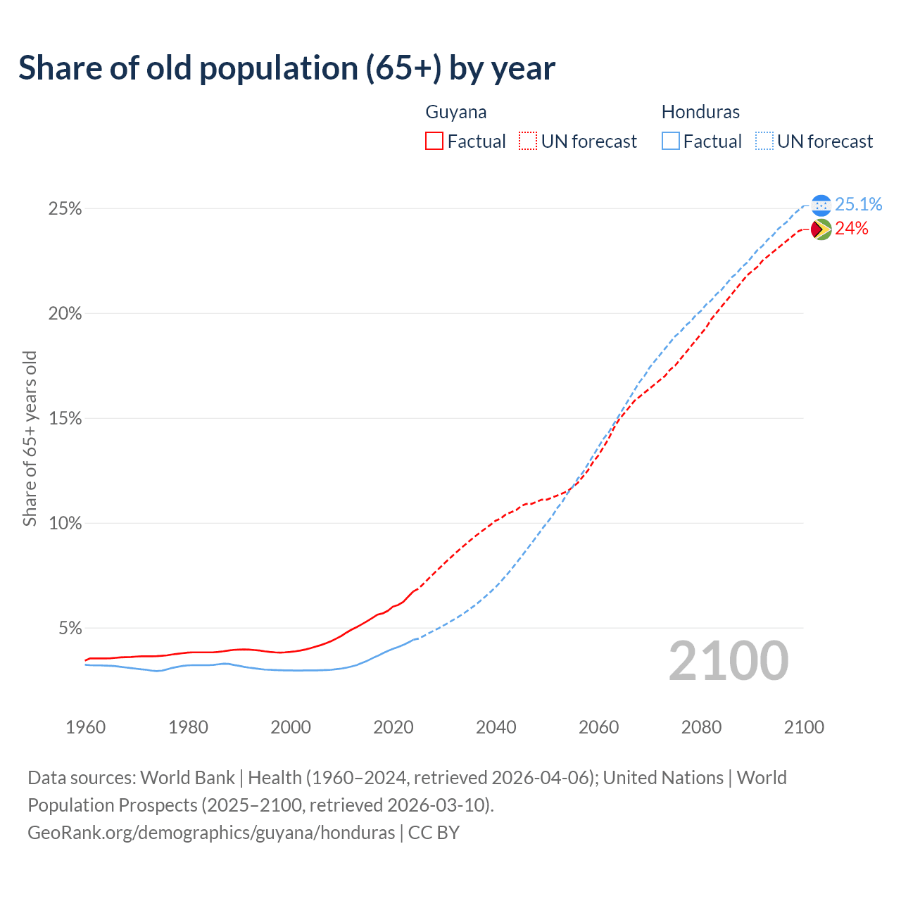 The share of older people aged 65 and over is 6.73% in Guyana and 4.42% in Honduras. Life expectancy in Guyana compared to Honduras .