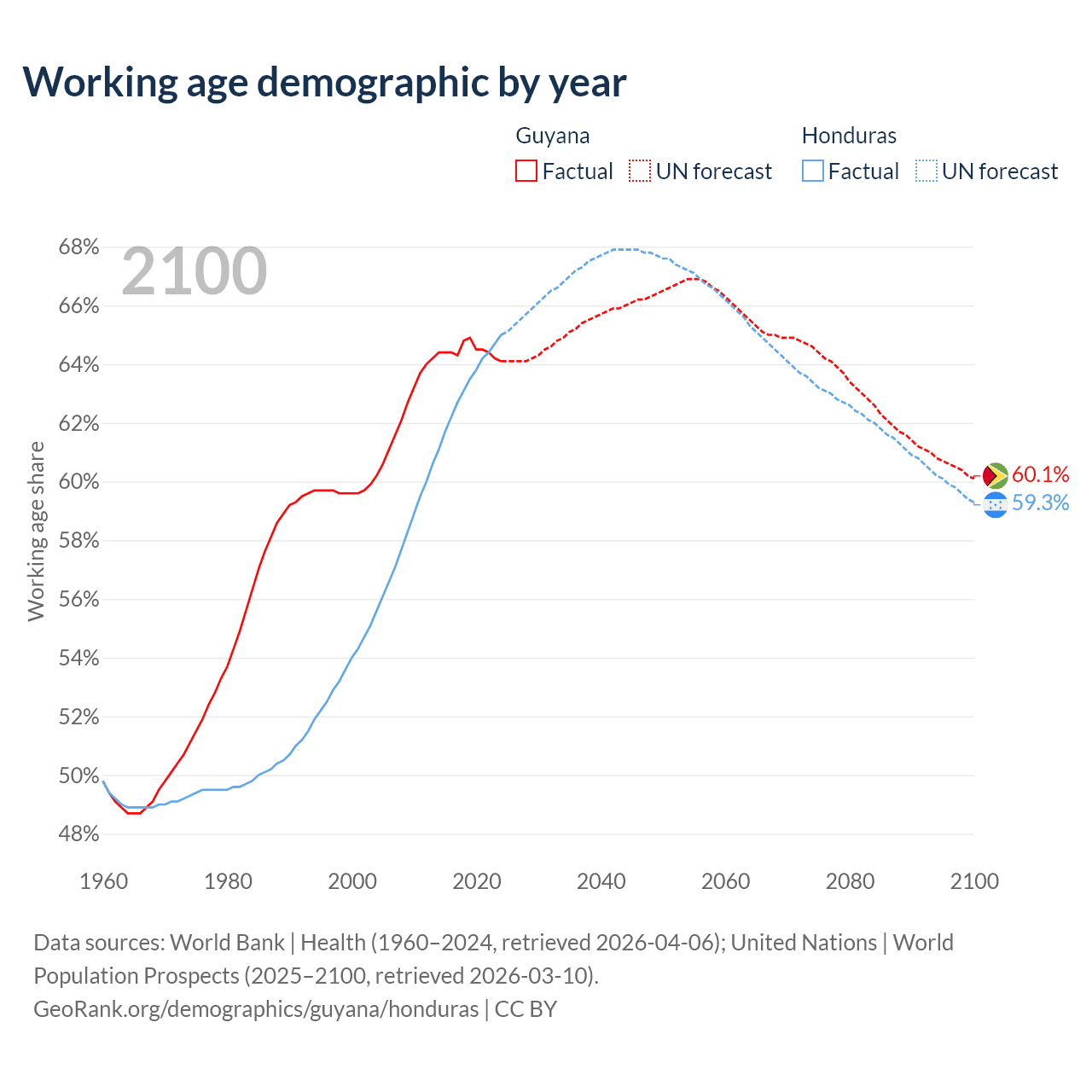 Median age Guyana vs Honduras, 1960-2100
