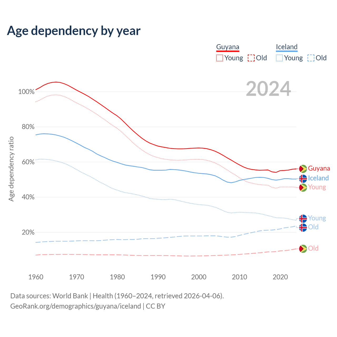 - Guyana is ranked 122/196 by median age (oldest to youngest) vs 65/196 for Iceland.