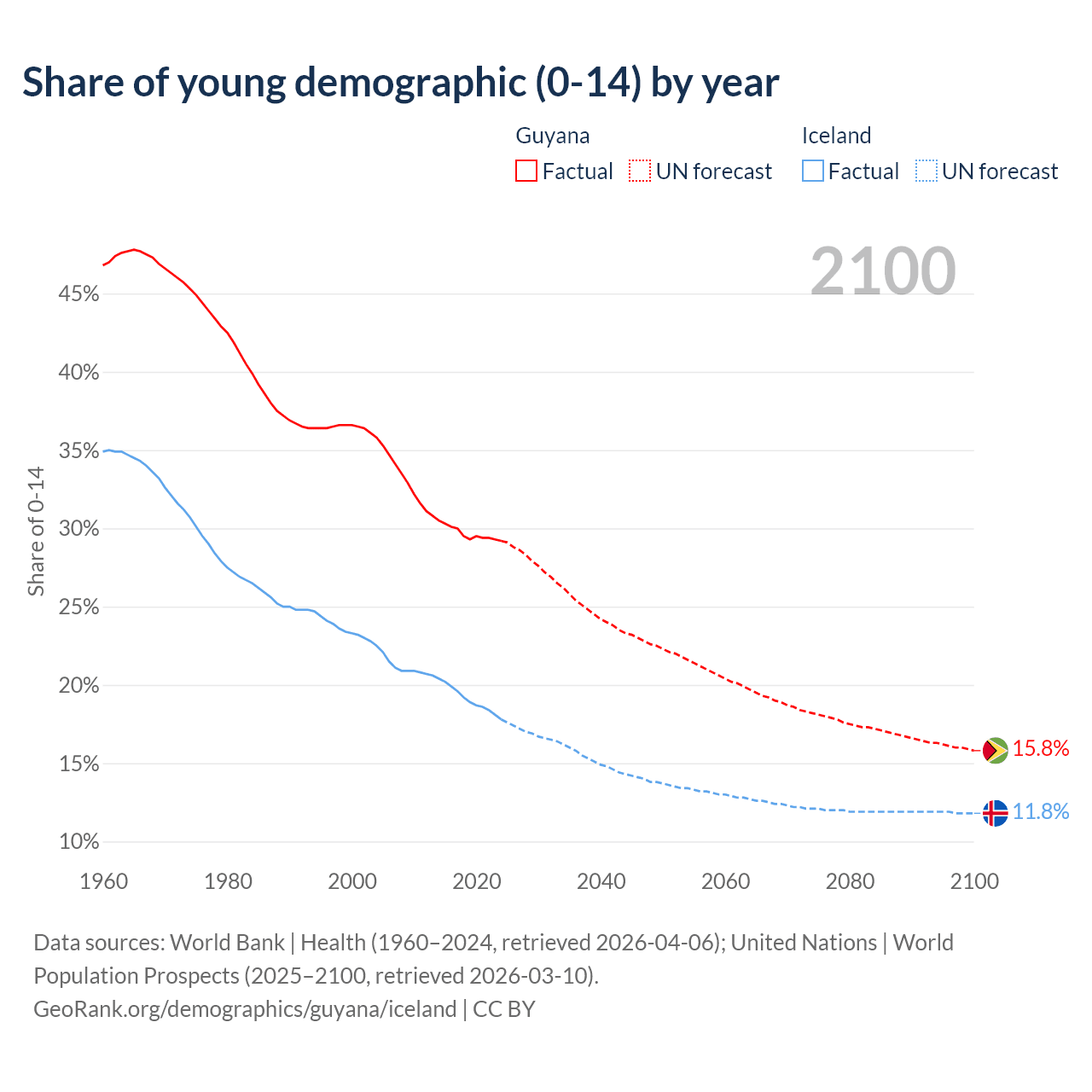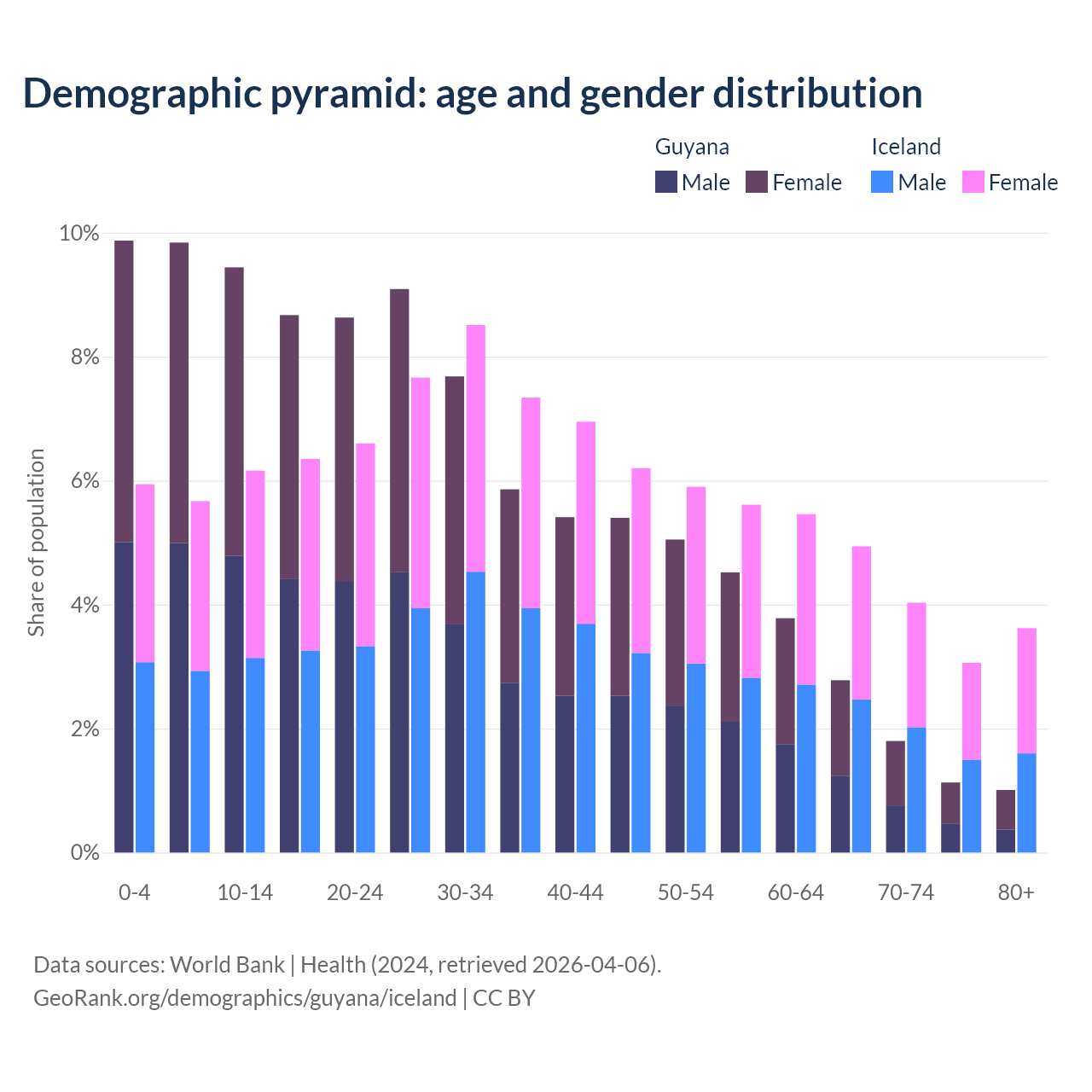- The share of young demographic (0-15 years old) in Guyana is 29.2% vs 17.8% in Iceland.