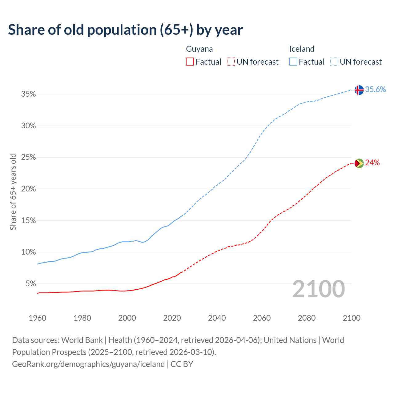 - The share of old-age demographic (65+) in Guyana is 6.73% vs 15.6% in Iceland.