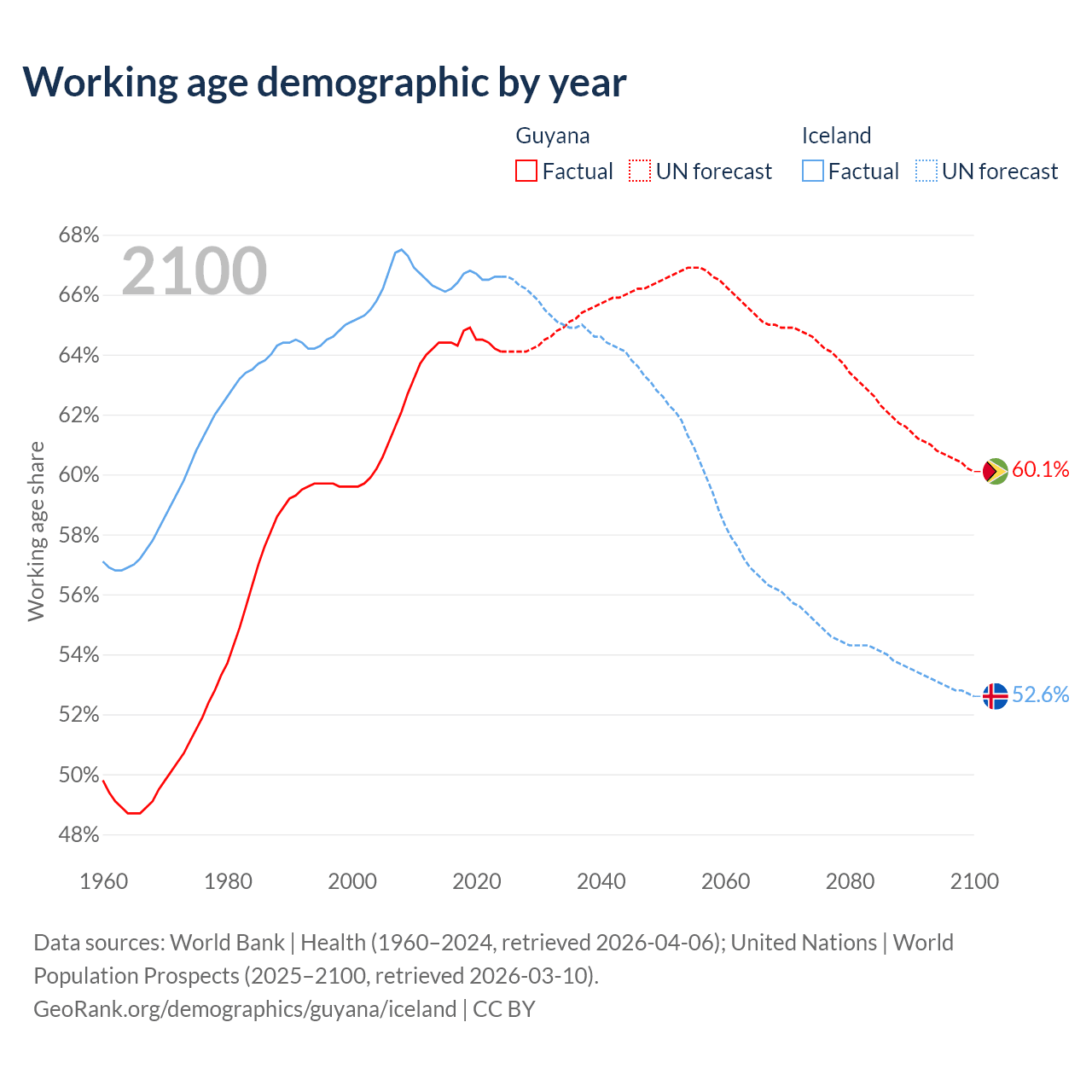 Median age Guyana vs Iceland, 1960-2100