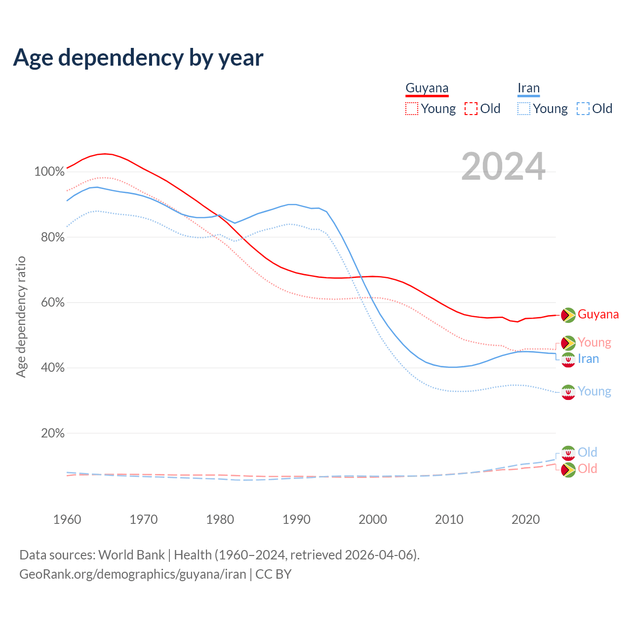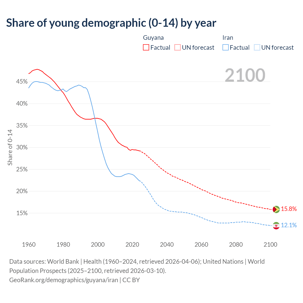 - The share of young demographic (0-15 years old) in Guyana is 29.2% vs 22.4% in Iran.